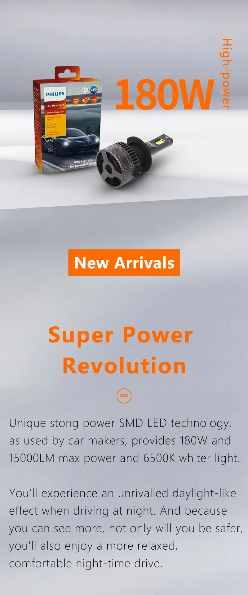 Philips Ultinon Rally 3590 LED H4 H7 H11 HB3 HB4 HIR2 180W Power Bright Car Headlight 6500K White Max Lumen Watt LED Bulbs