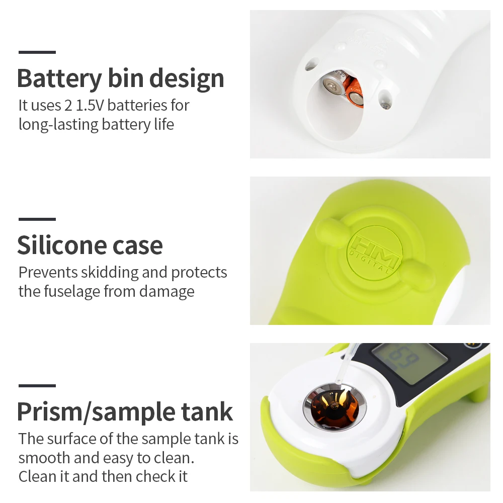 Measuring range: 0.0~55.0% Brix, Temperature range: 0~70°C