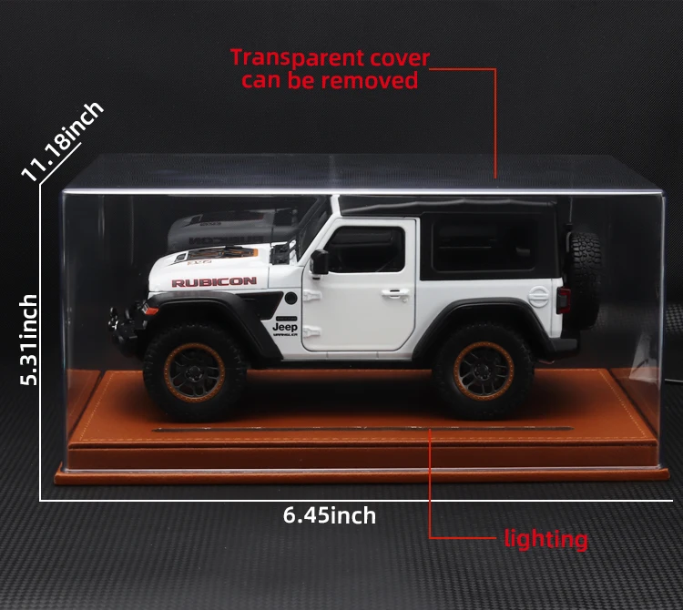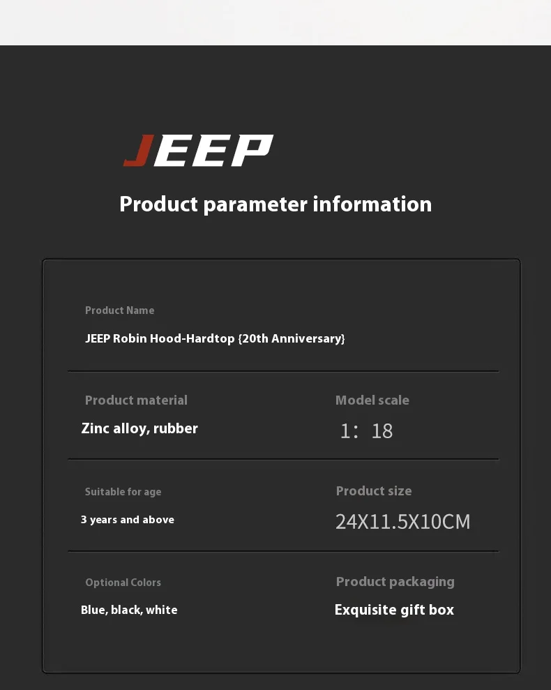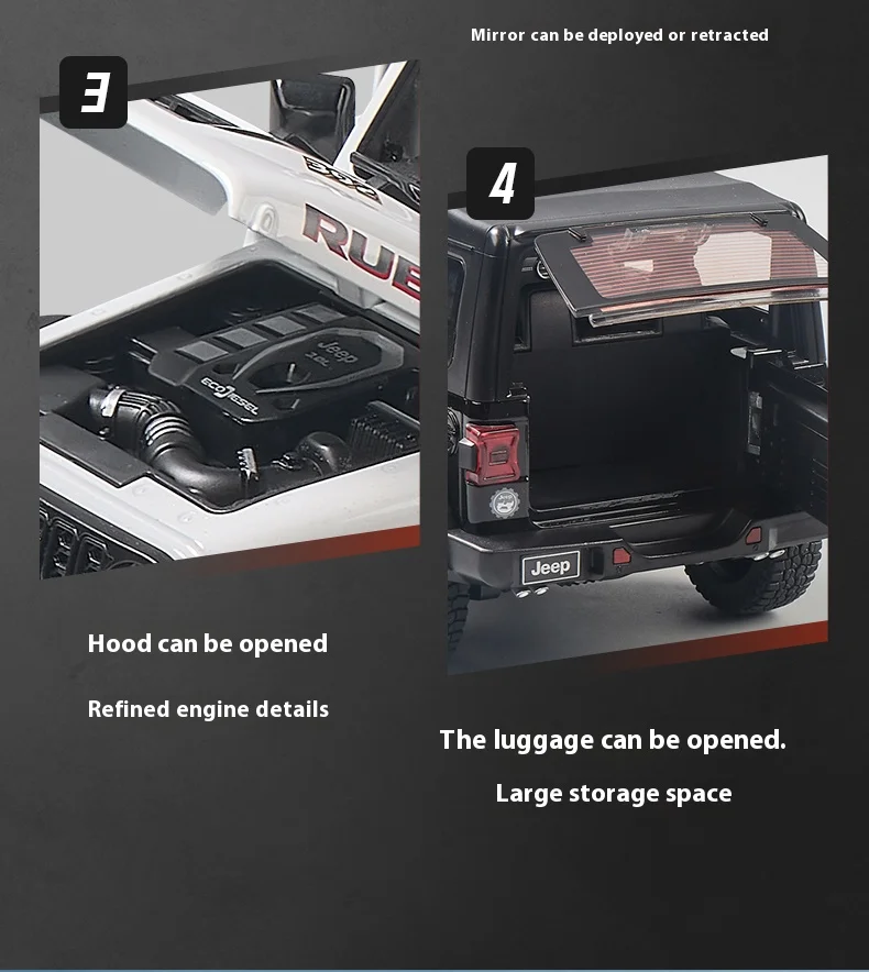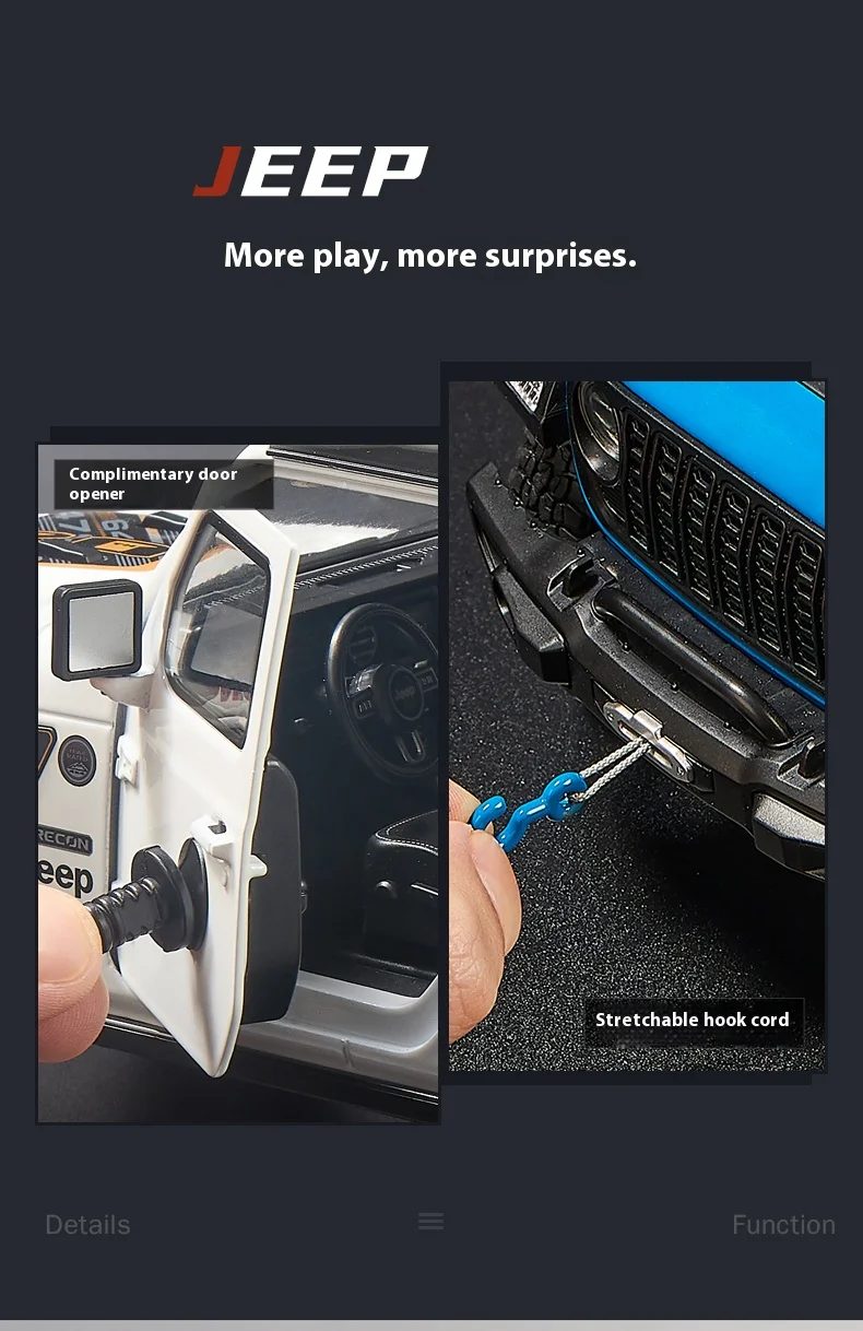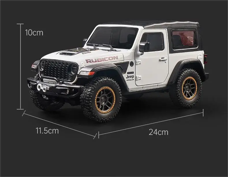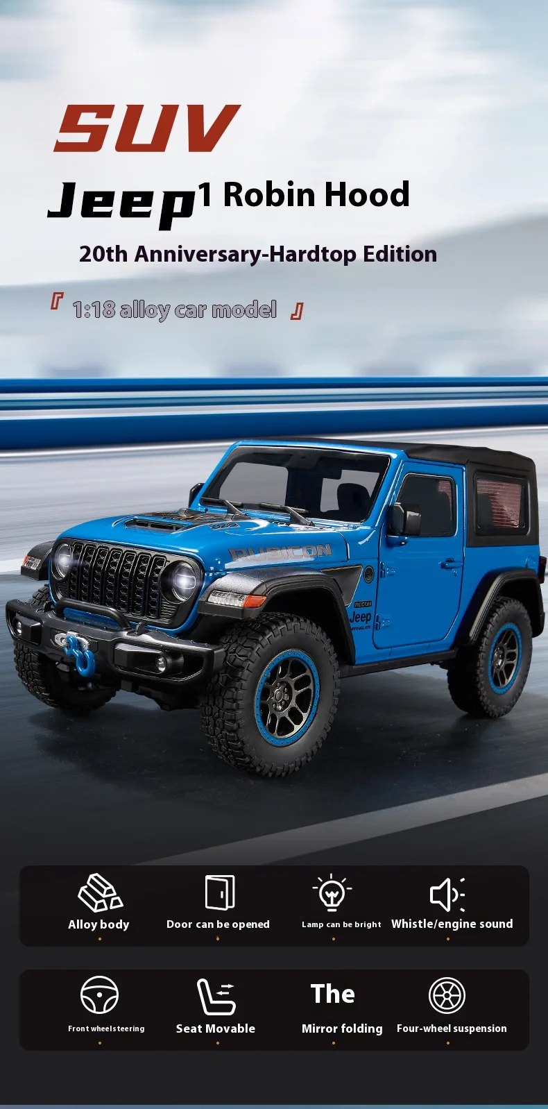 The 1:18 scale Jeep Wrangler alloy toy model boasts remarkable detailing, accurately replicating the iconic design of the real-life vehicle. It's the perfect replica for any Jeep enthusiast.