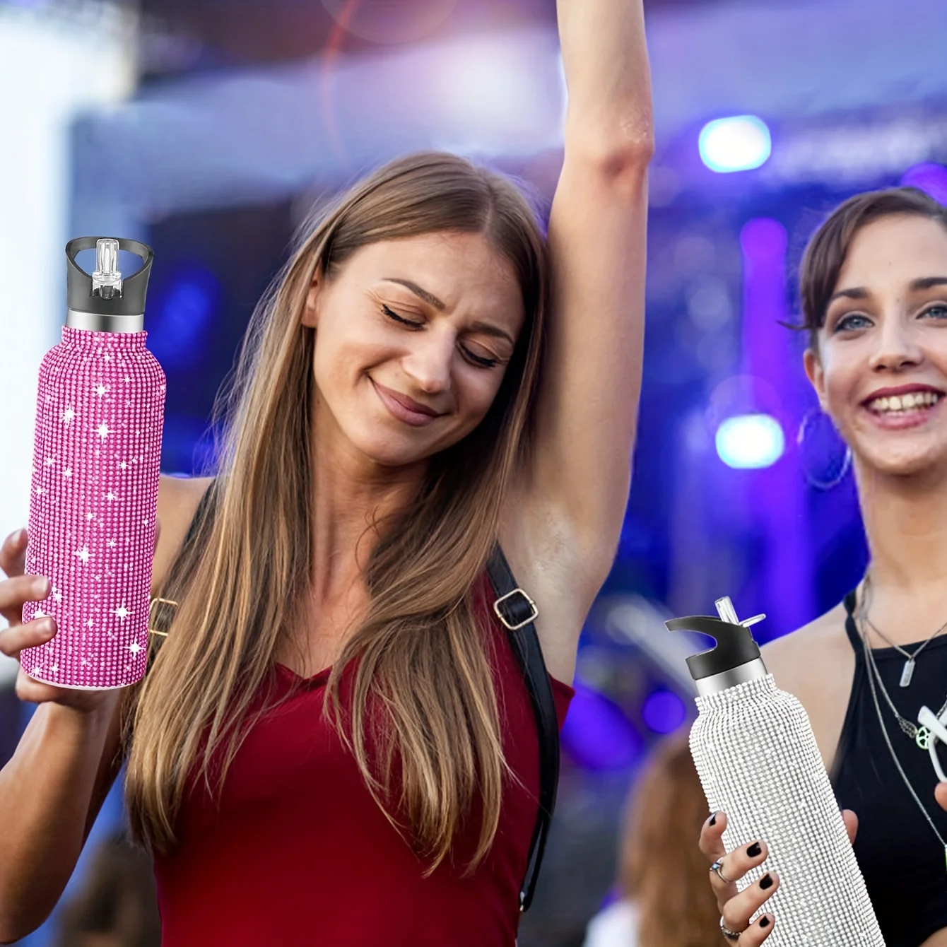1 Piece 17oz/25oz Sports Diamond-encrusted Stainless Steel Thermos Cup With Straw Suitable For Hot And Cold Drinks