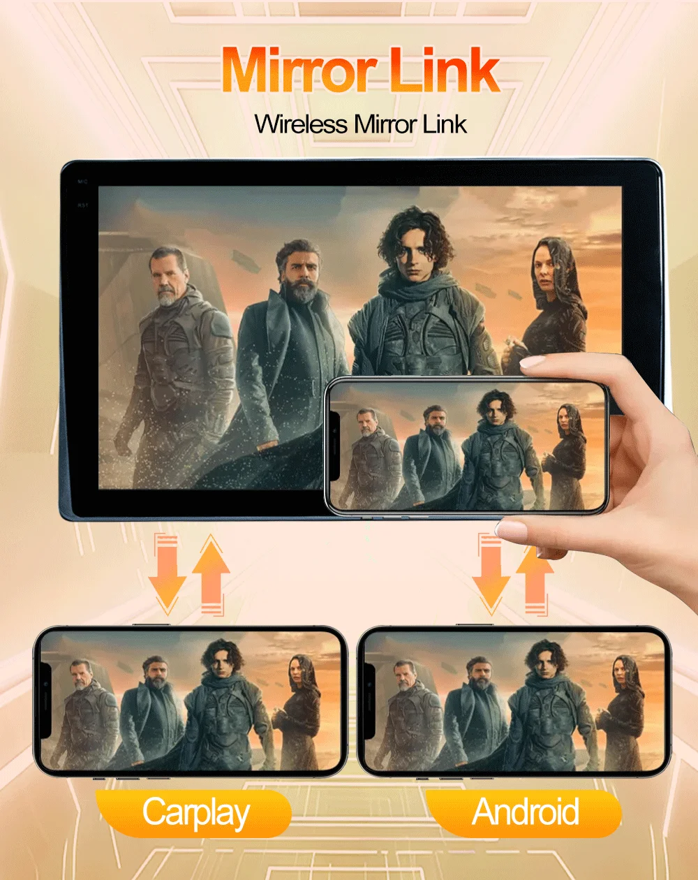 Wireless Apple Carplay and Android auto: Connect Bluetooth and keep wifi open. You can easily connect them with your smartphones and control the car video player in the back seat when you are sit in the driver's seat, such as playing videos, listening to music, watching movies, etc.