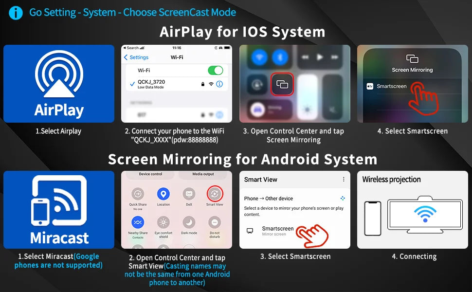 First pair the mobile phone with Bluetooth, and then connect to the WIFI signal. After both are connected, carplay/android auto will automatically jump to the corresponding interface.