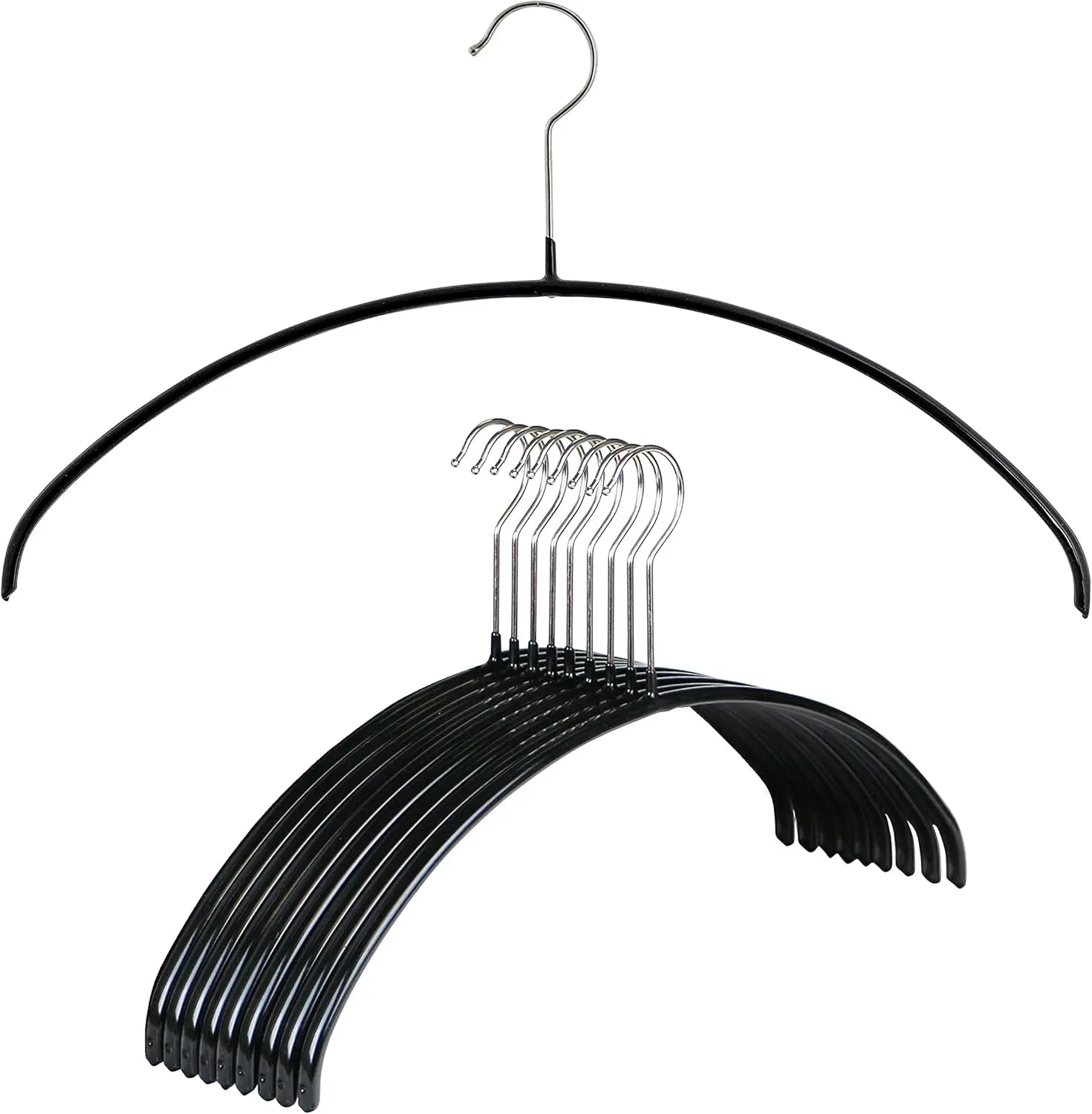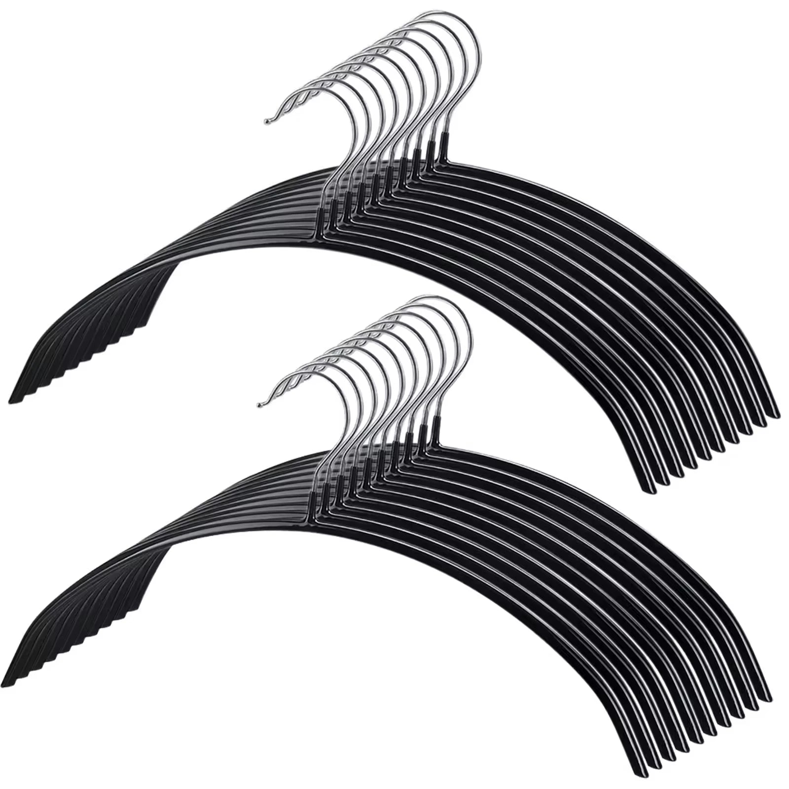 Pack of 10 pieces black hangers; Each measures 42 x 19.5 cm; 3.8 cm hook opening to fit all standard closet rods.