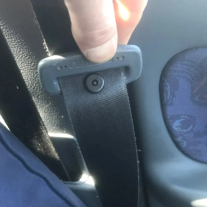 The seat belt anti-slip buckle is divided into two parts/halves, one half has a pin and the other half has a hole.