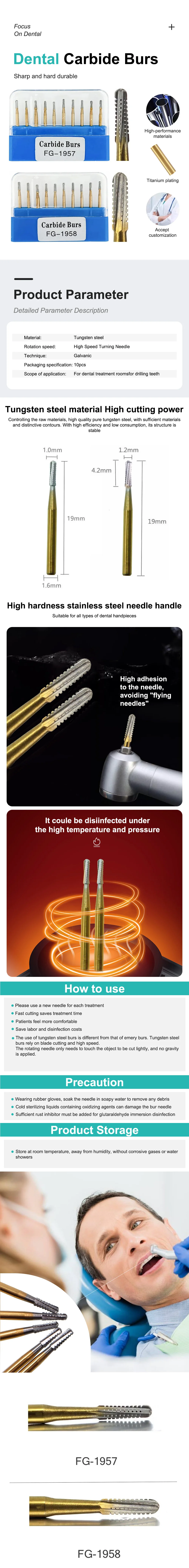 10Pcs/Box FG1957/FG1958 Dental Carbide Bur Denspay Golden High Speed Tungsten Steel Crown Metal Cutting Burs Dentistry Tools
