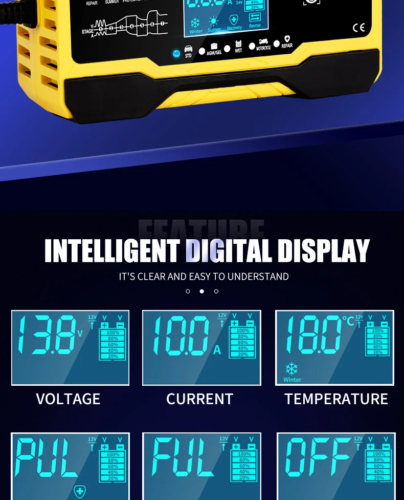 • Digital Display :The charger has a digital display that shows the battery's voltage and charging status, making it easy to monitor the charging process.