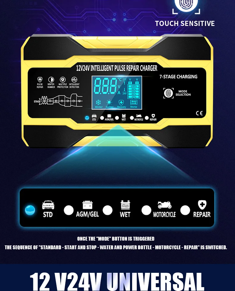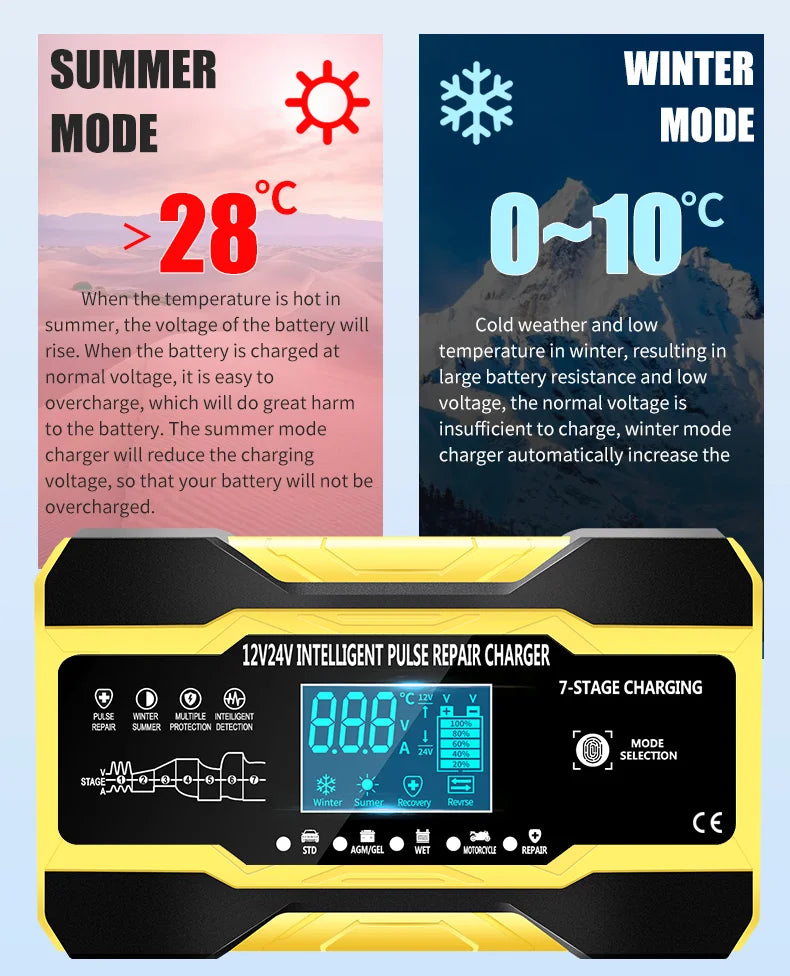 12V-24V Car Battery-Charger Full Automatic 12V 10A Digital Car Battery Charger Pulse Repair for AGM GEL WET Lead Acid