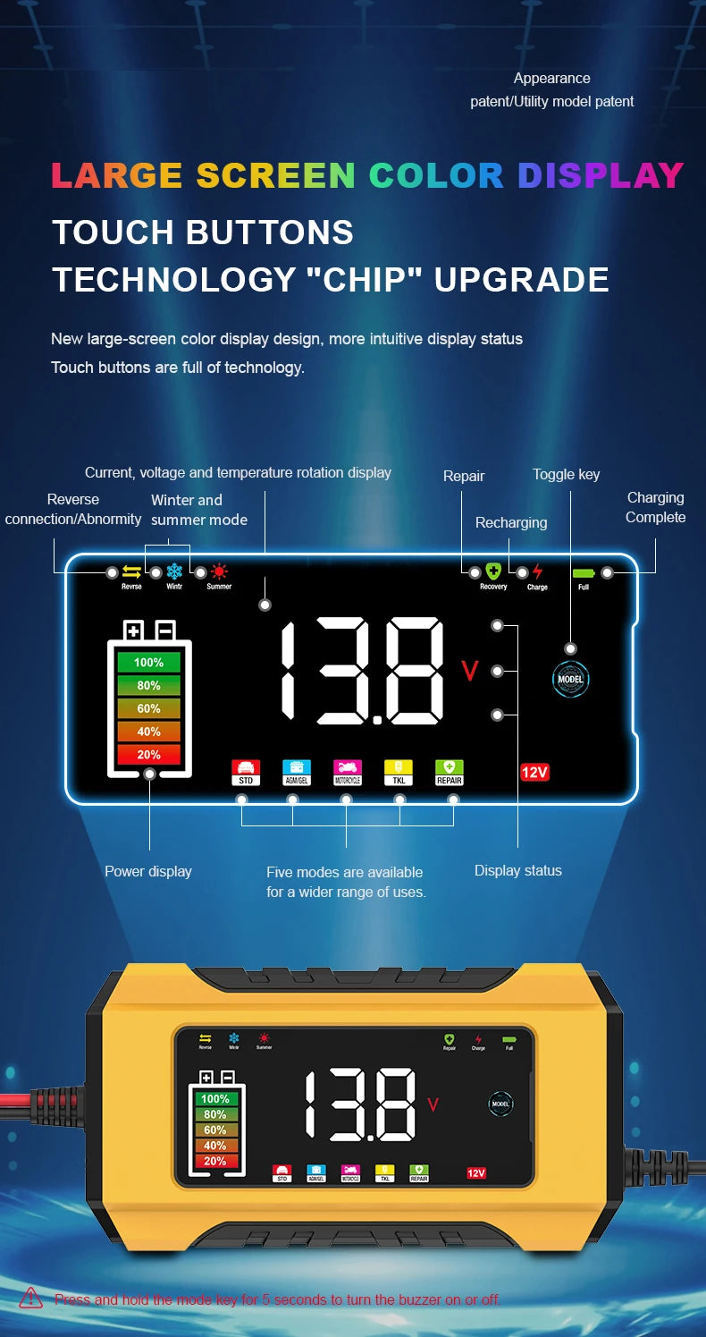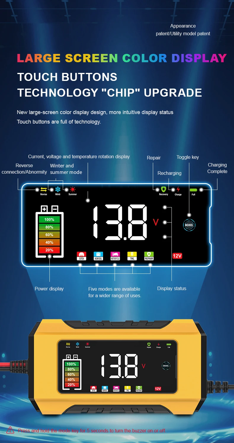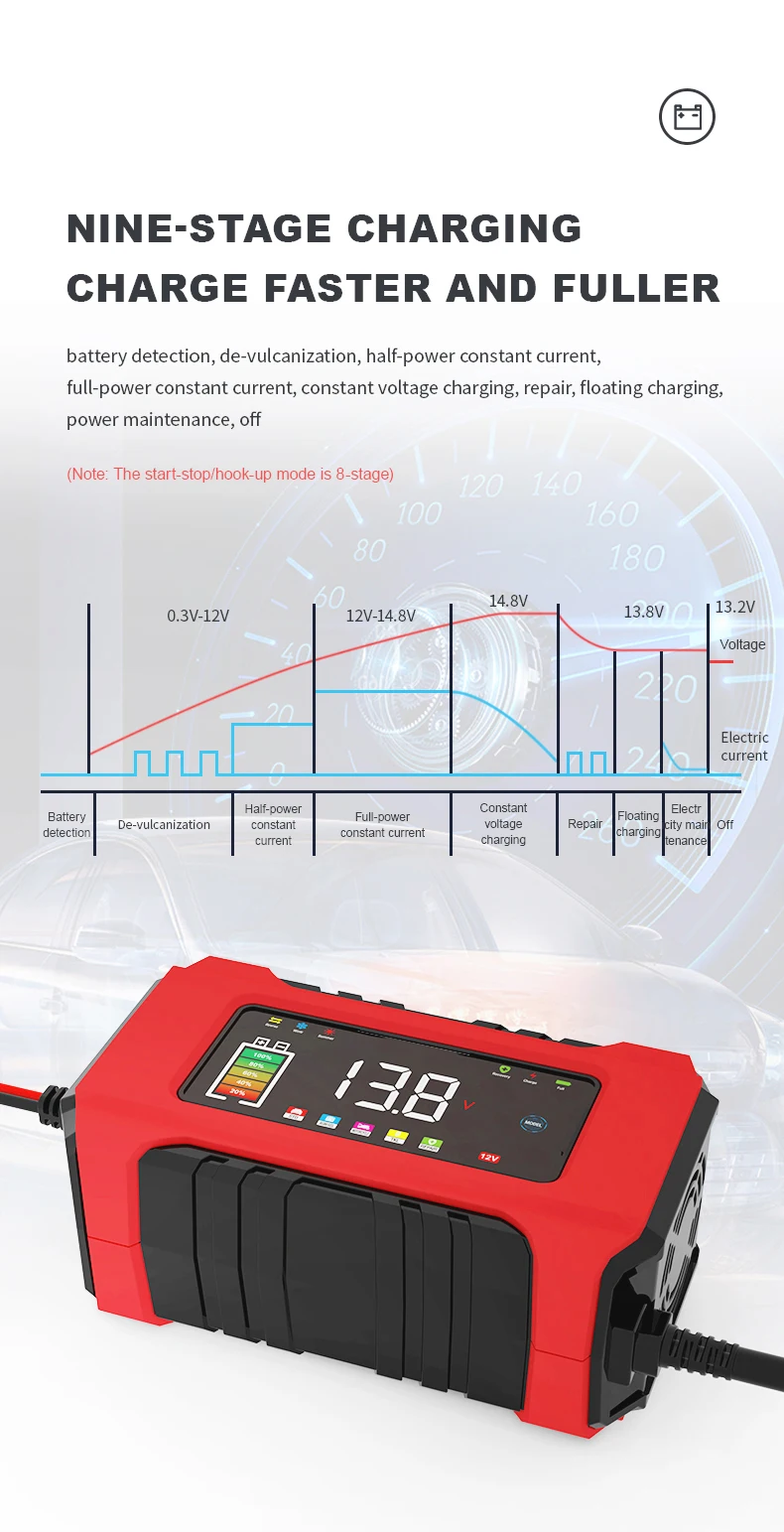 12V 6A Fully Automatic Car Battery Charger Smart Pulse Repair Color Screen for AGM GEL WET Lead Acid Charger LCD Display
