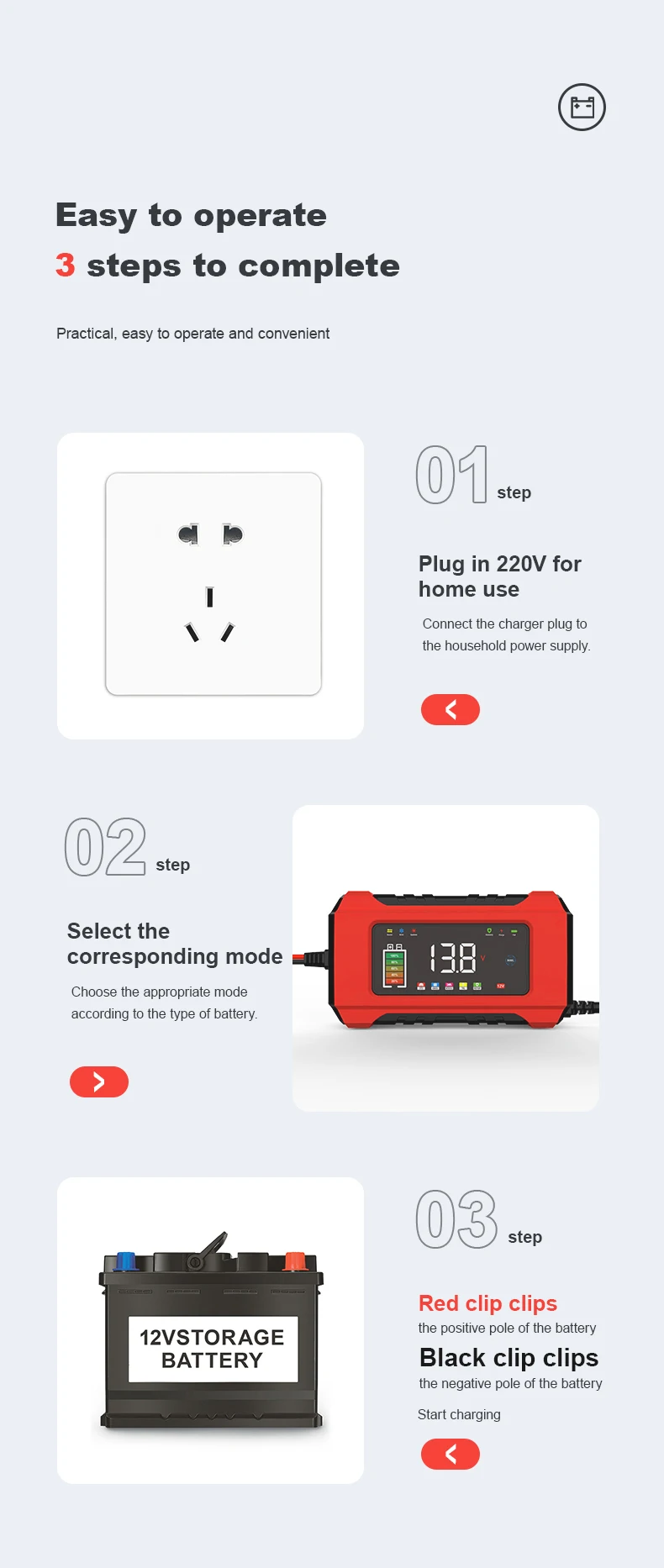 Scope of application:12V 2Ah-100Ah Lead-acid battery (Lithium batteries are disabled)