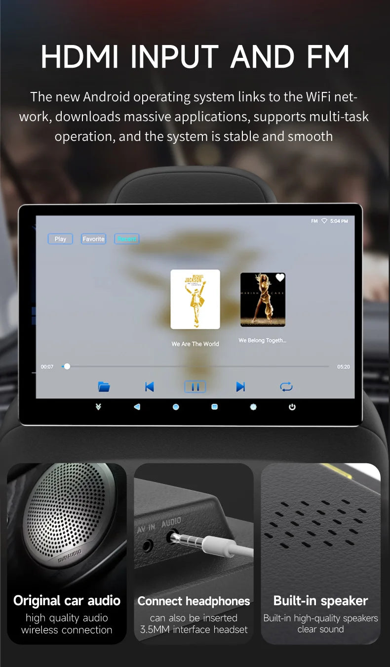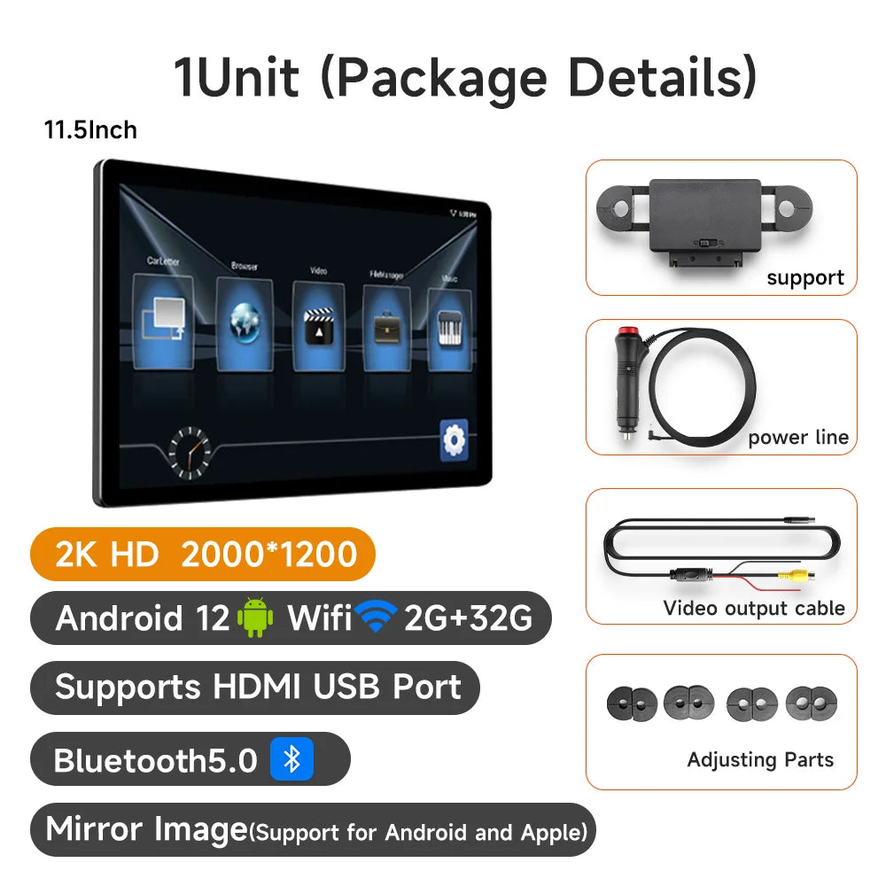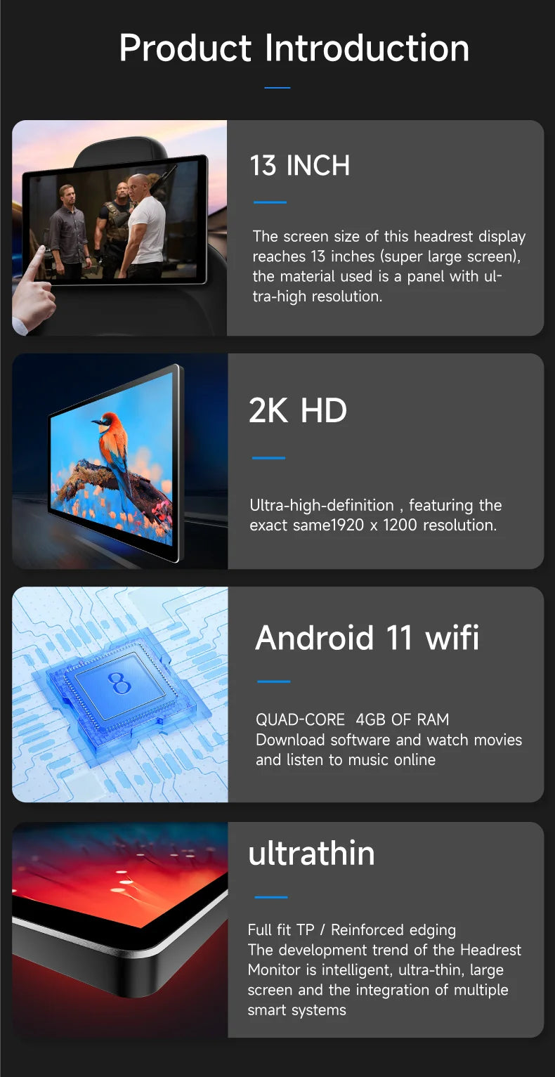 13" Headrest Monitor Android 12 Car Display IPS 2K HD For Car Rear Seat Tablet Touch Screen Video Music TV Player HDMI Input