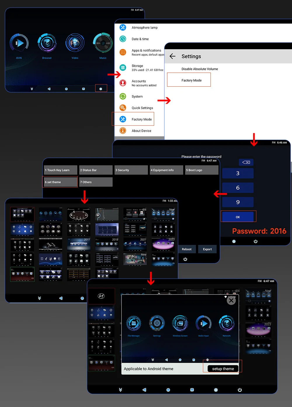 Theme setting steps:: Settings Factory -Factory Mode -Factory Mode -(Password: 2016-)Set theme
