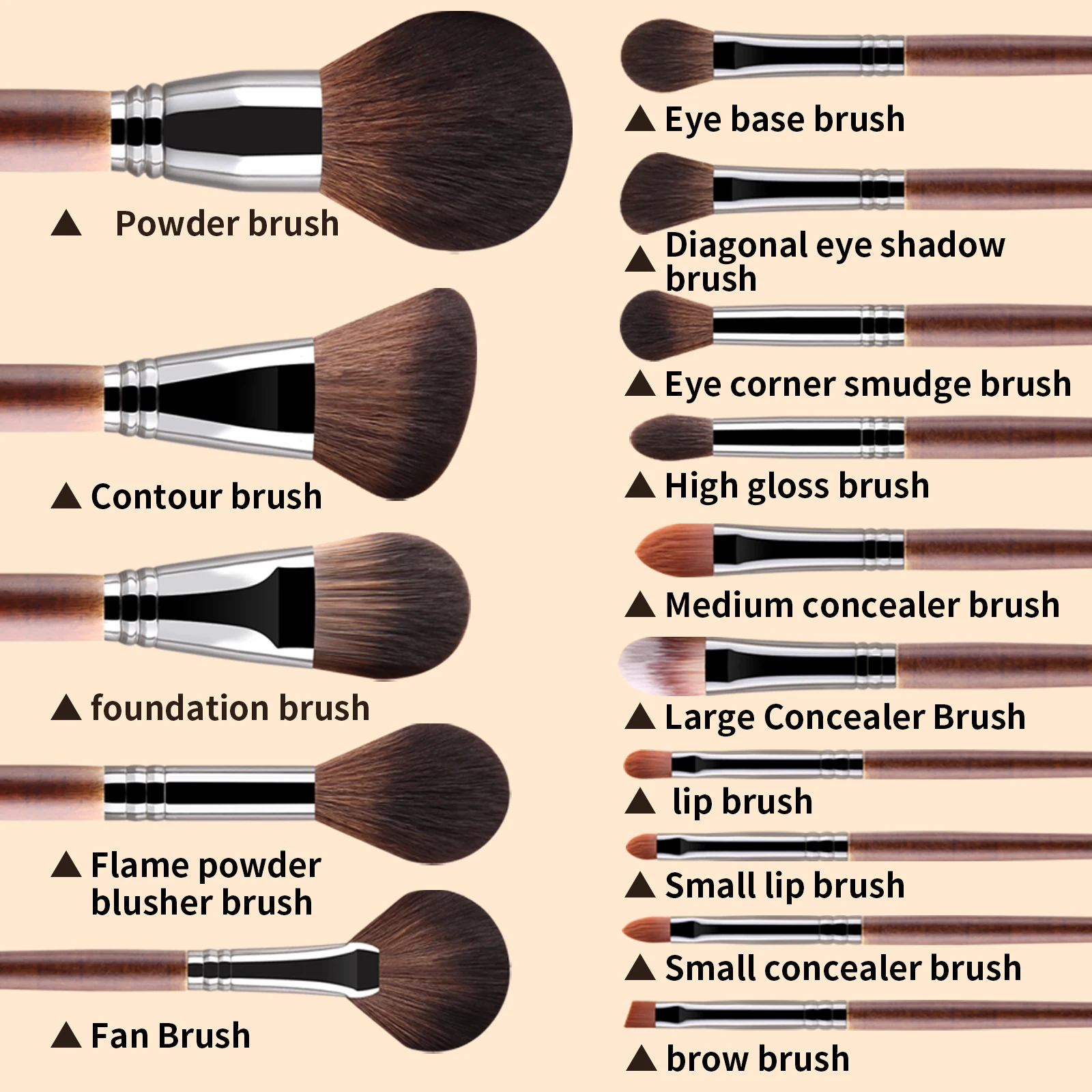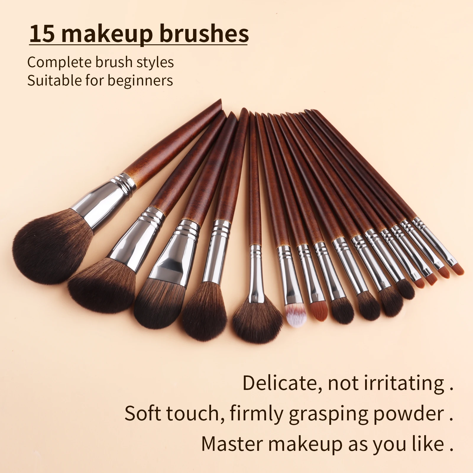 The set includes: 15 wooden handle makeup brushes (3 for base makeup, 3 for contouring and brightening, 7 for eye makeup, and 2 for lip makeup)