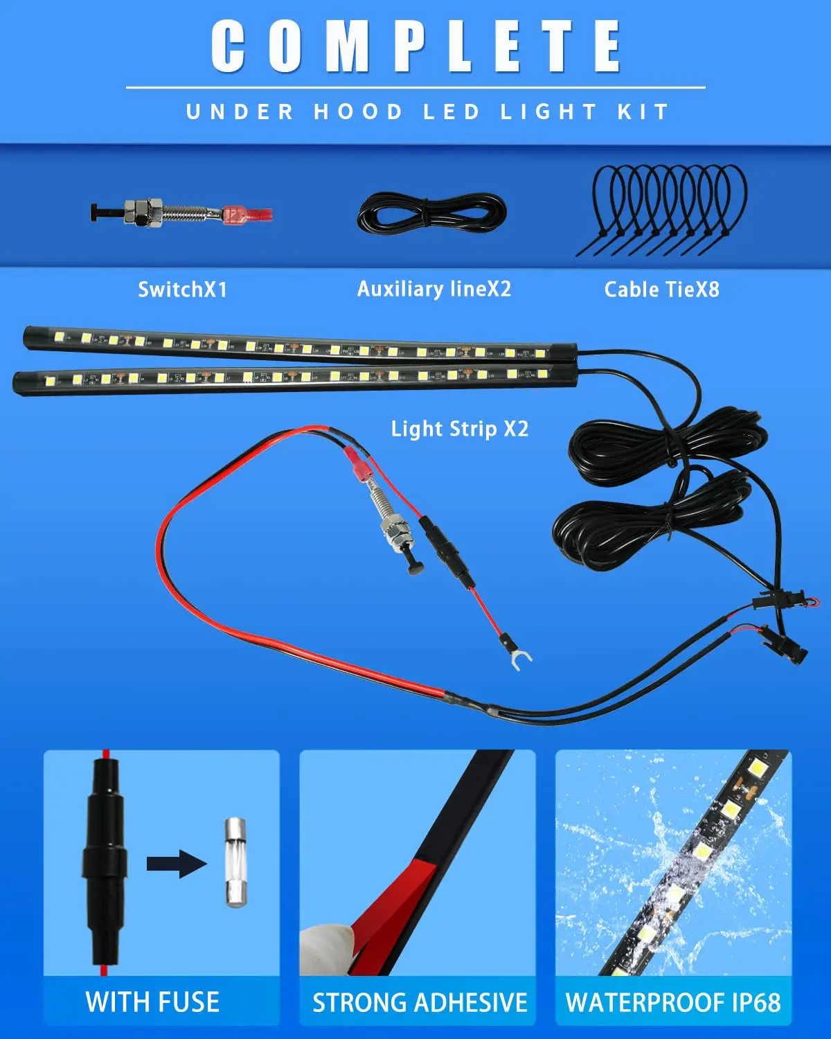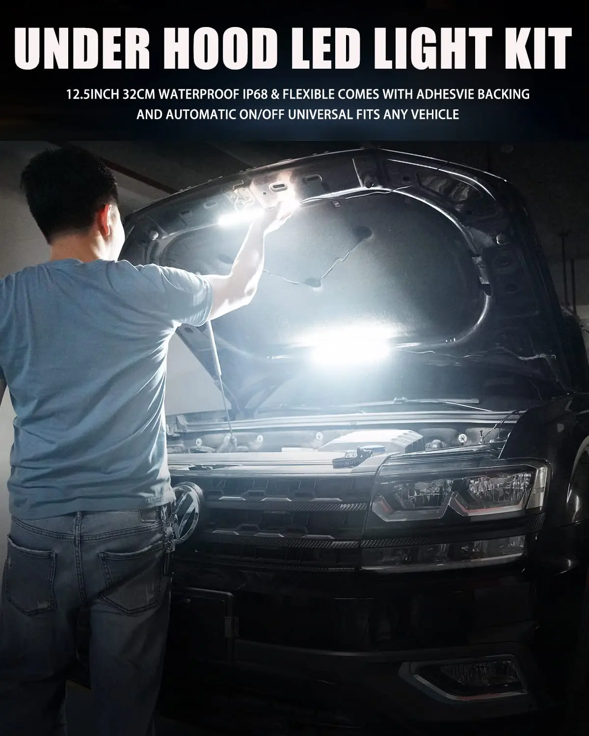 1set LED Car Under Hood Work Inspection Light Kit Waterproof 12V White LED Strip Lights Bars Car Hood Lights Fits Any Vehicle