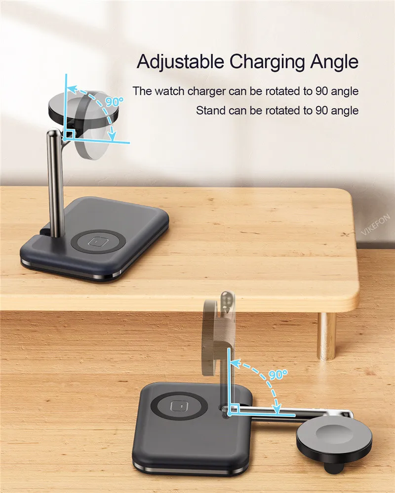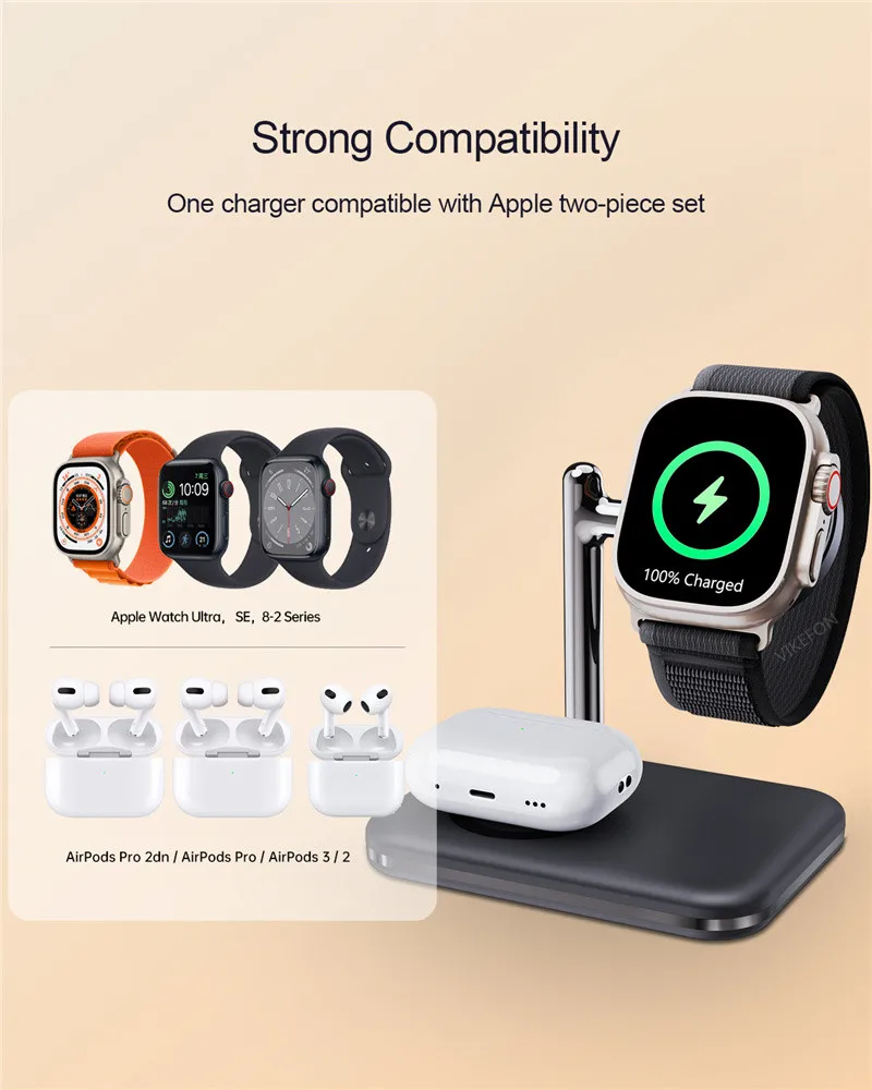 [2 in 1 Charging Stand for Apple Watch & AirPods] VIKEFON 2-in-1 Wireless Charger can charge for Apple Watch and AirPods simultaneously. The watch chager was built in a strong magnet to make your watch stay in place quickly and confirmly to get a more stable charging experience.