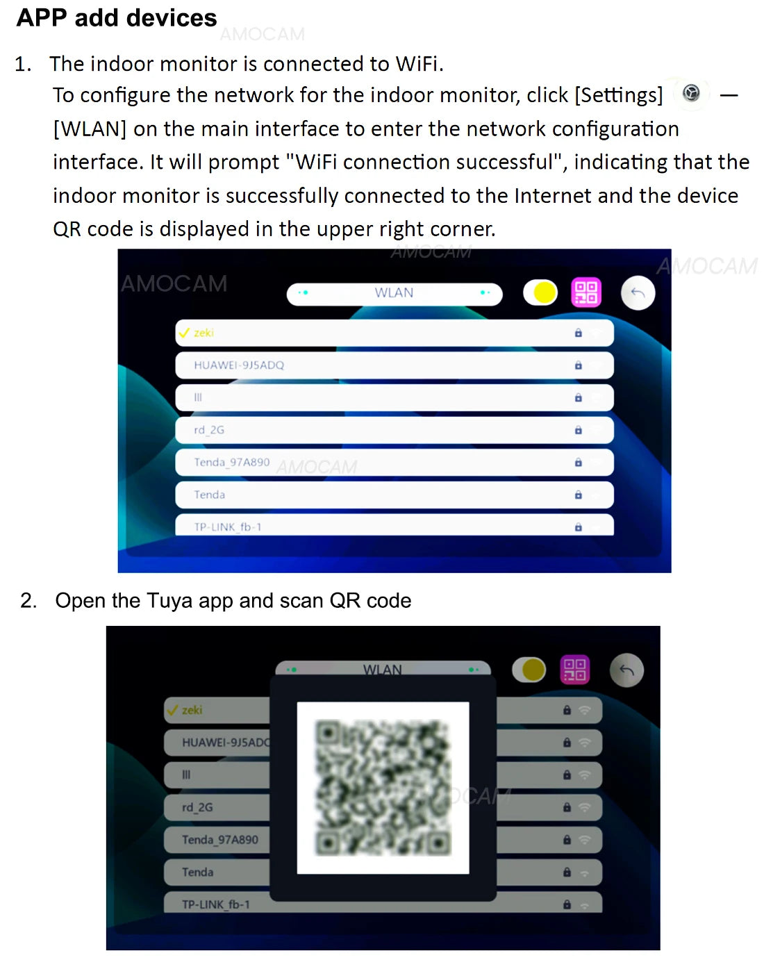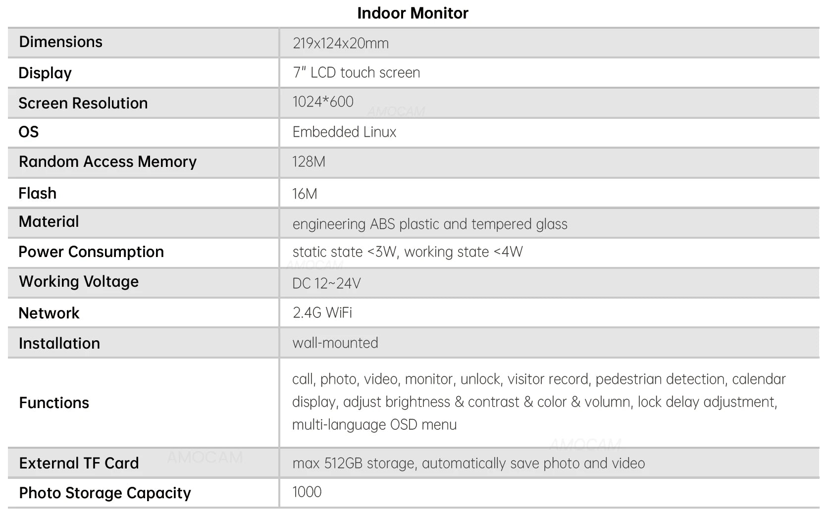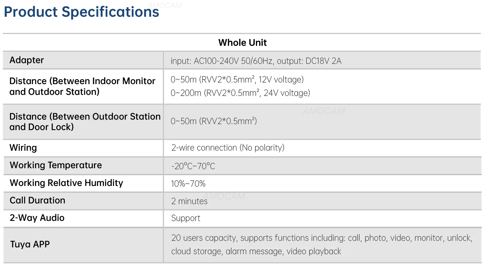 - Connectivity: WiFi wireless/wired internet for indoor monitor, 2-wires connection between indoor monitor and outdoor camera