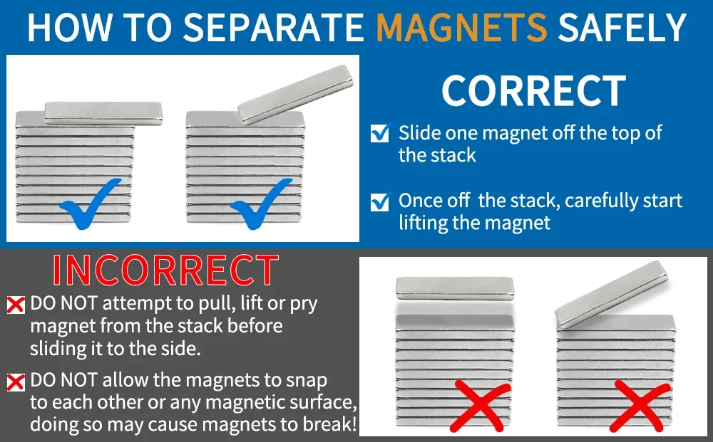 1. The large neodymium magnets are extremely strong, and must be handled with care to avoid personal injury and damage to the magnets. Fingers and other body parts can get severely pinched between two attracting magnets. It is easy broken,please be careful.