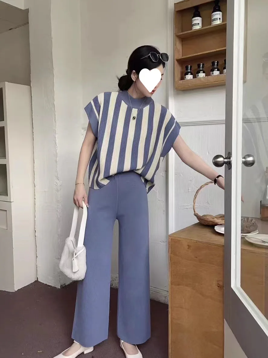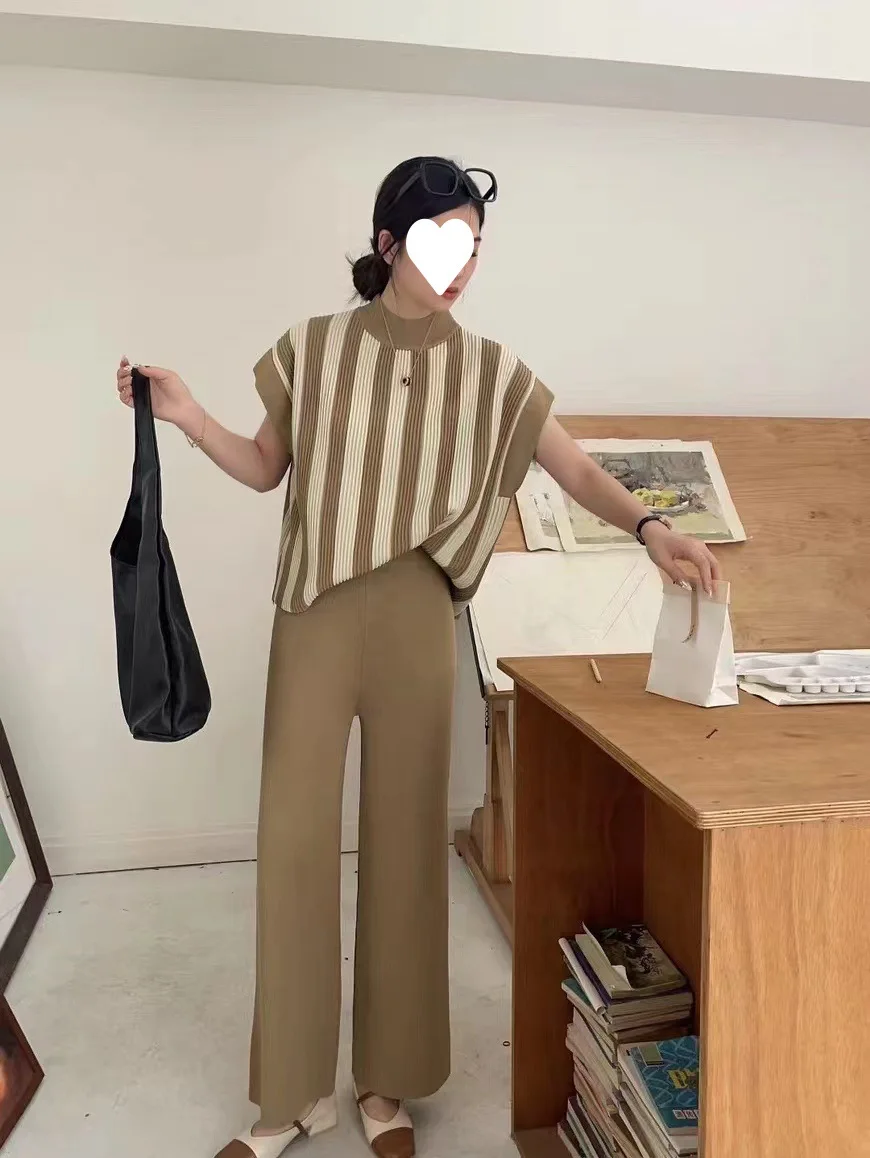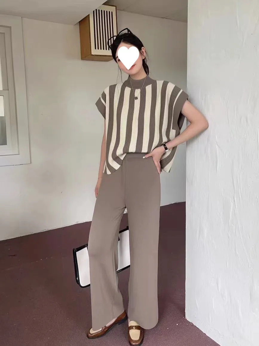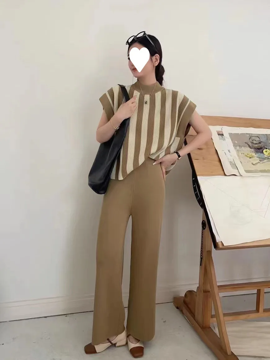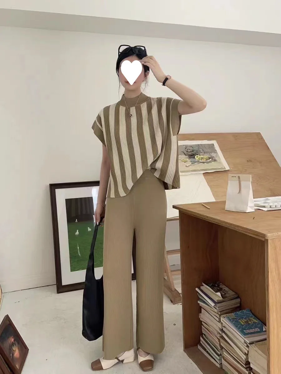 2024 Fashion Minimalist Patchwork Loose Short Sleeved Sweater Top High Waisted Slimming Wide Leg Pants Two-piece Set