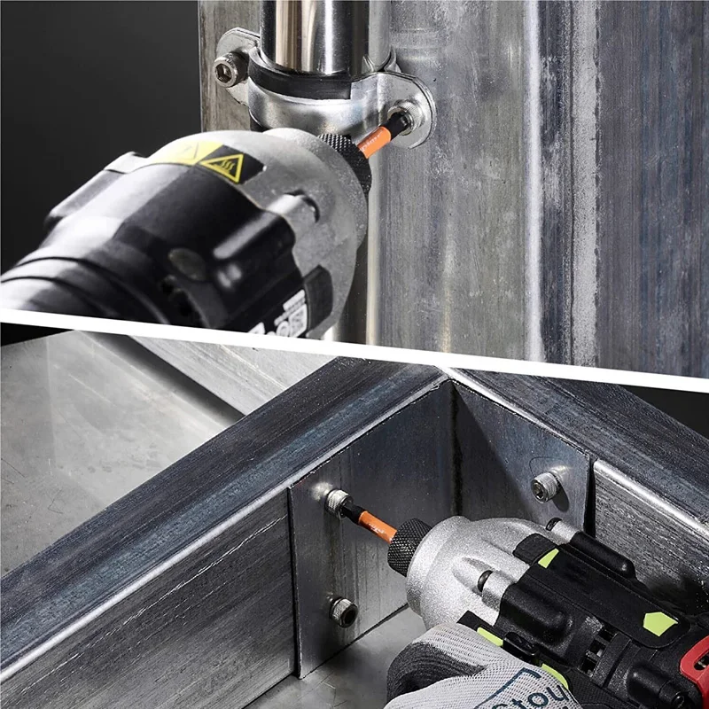 CNC machined tips, S2 alloy steel body, hardened core to increase bit strength and reduce fracture. Manganese Phosphate to prevent rust. Strengthened magnetic impact bit helps you easy pick up screws.