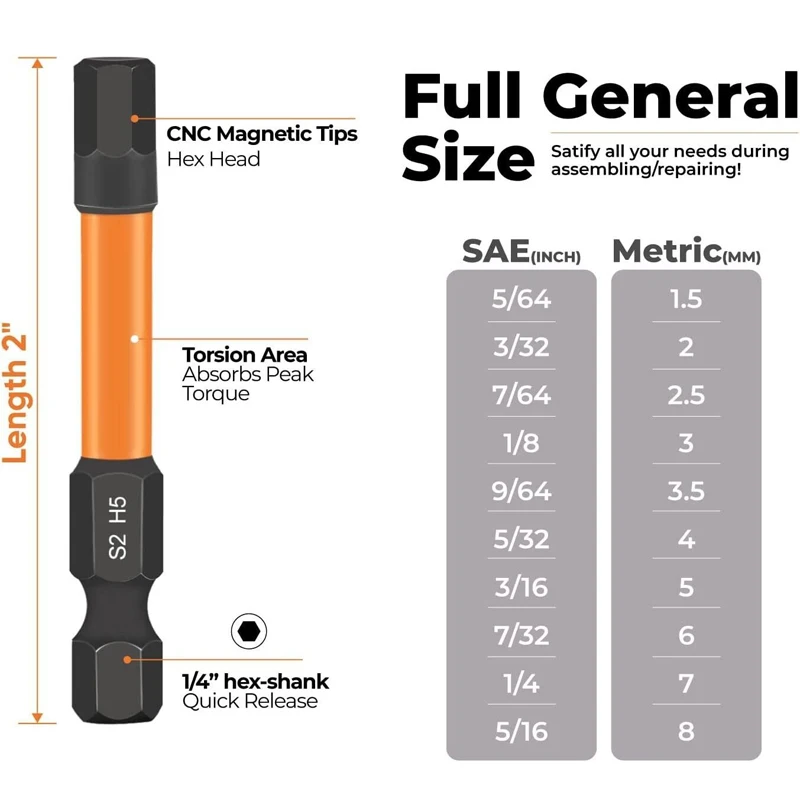 10pcs metric hex bits set-1.5mm, 2mm, 2.5mm, 3mm, 3.5mm, 4mm, 5mm, 6mm, 7mm, 8mm. 10pcs SAE hex bits set-5/64inch,3/32inch, 7/64inch, 1/8inch, 9/64inch, 5/32inch, 3/16inch, 7/32inch, 1/4inch, 5/16inch. 1/4inch quick release hex-shank, 4inch long.