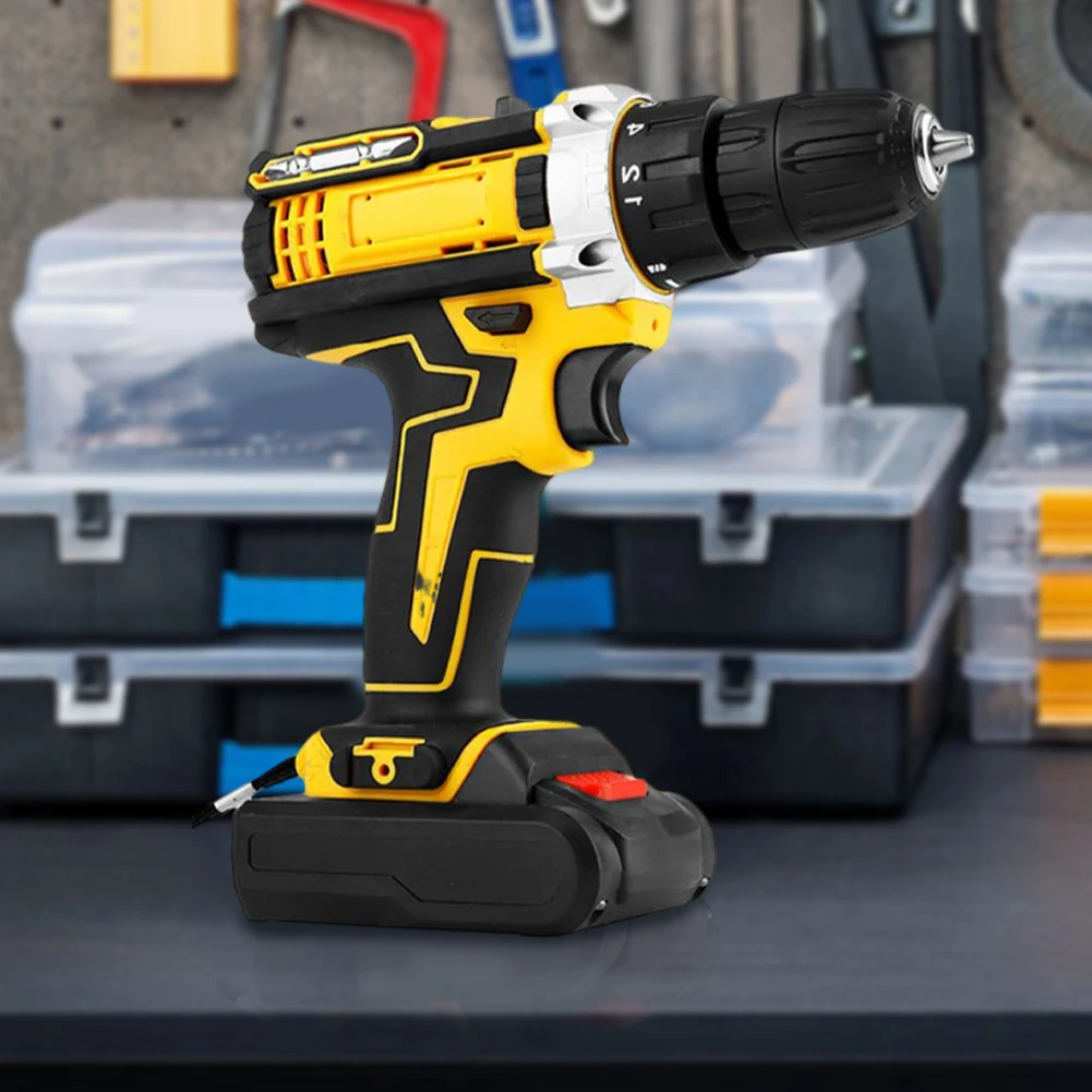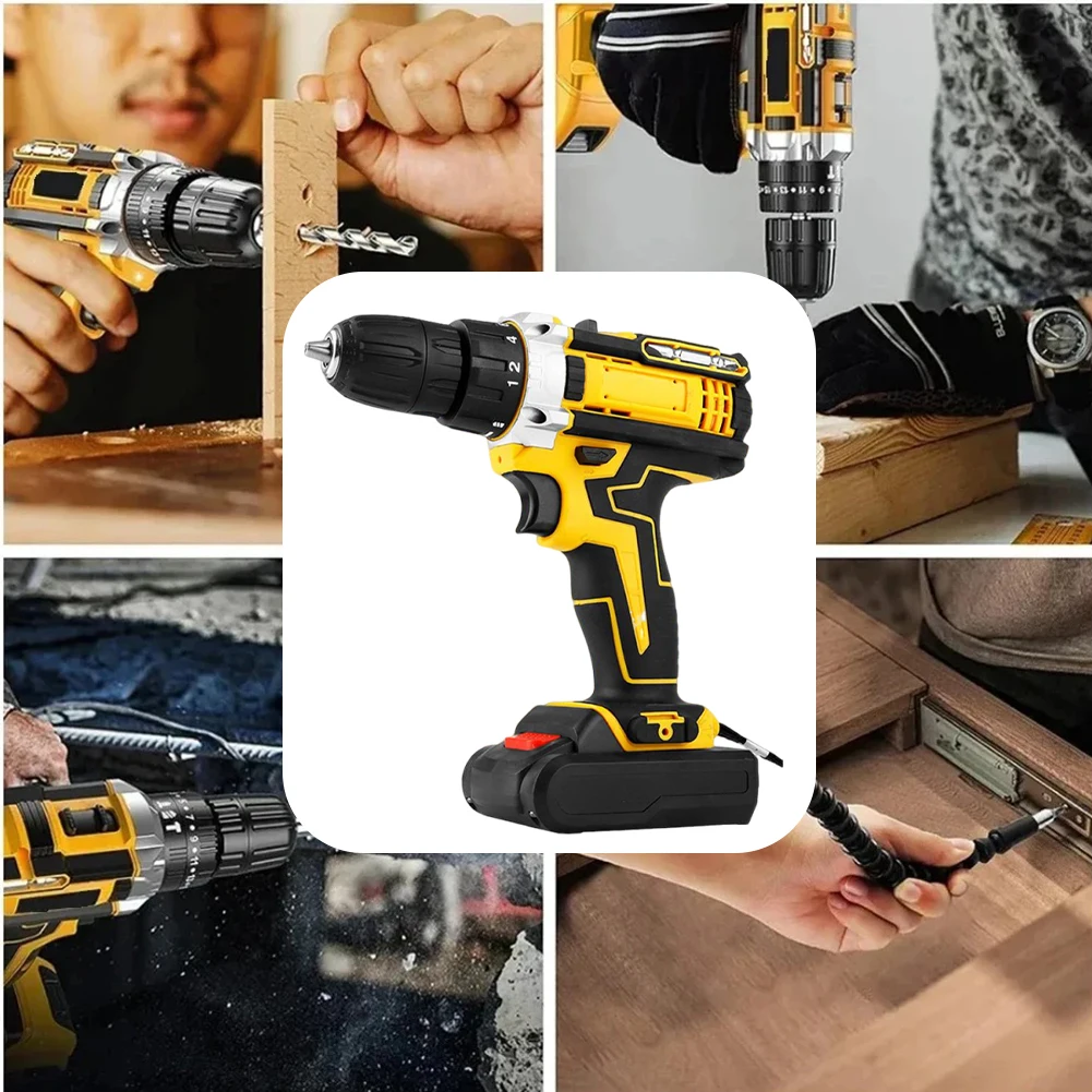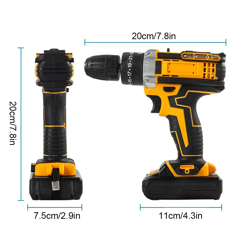 Note: 24 in 1 Cordless Drill Set 21V Brushless Electric Drill with Drill Bits Lithium Electric Hand Drill 3/8-Inch Keyless Chuck Battery Powered Screwdriver Driver 25+1 Clutch for Plastic Wood Metal Screws Feature: 1.Automatic 3/8" Chuck & 25+1 Clutch: The Brushless Electric Drill features a large 3/8" (10mm) keyless chuck for superior bit retention, fulfilling your needs in home renovation, DIY crafts, garden work, or automotive repair. 2.Motor Design: This Battery Power Screwdriver Driver boasts a full copper dual-bearing gear motor design that delivers powerful and steady performance. Explore more life hacks such as polishing and grinding with its 21V Max drill. 3.Ergonomic Comfort: Equipped with dampers and soft rubber-molded grips, the Power Drill provides maximum user comfort with less vibration. Control this tool effortlessly without fatigue while using the trigger-activated LED light to illuminate your work area. 4.Well-Balanced Construction: The Electric Power Drill's top balancer aids in maintaining horizontal accuracy, ensuring precision in your projects. 5.Comprehensive Package: Includes one 21v cordless drill, charger, magnetic flexible shaft, magnetic drill bit holder, six drill bits, six screwdrivers, nine sleeves, drywall anchors, and a storage box. Specification: Drill Type: Impact Drill Origin: Mainland China Shell material: ABS+rubber Specifications: 24-piece set Maximum torque: 25+1 N.M Maximum speed: 1350rpm Maximum power: 600W Gear: 2 adjustable gears Motor type: brushless motor Voltage: 21V 1300 mAh lithium battery (battery included) Maximum chuck diameter mm: 10 Drilling capacity-wood mm: 22 Drilling capacity-steel mm: 10 Product size: about 210.00x200mm Weight: 900g