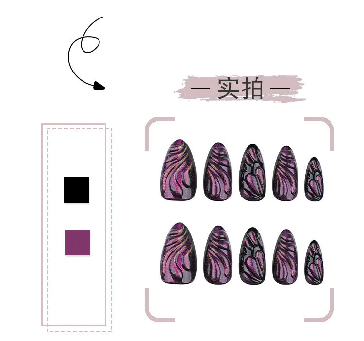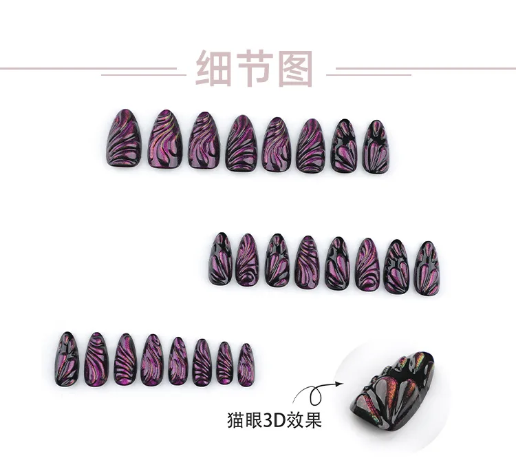 24PCS Droplet Mysterious Purple Cat Eye Press On Nail Full Cover Detachable Press On Nail Spice Girl Wearable Almond False Nail