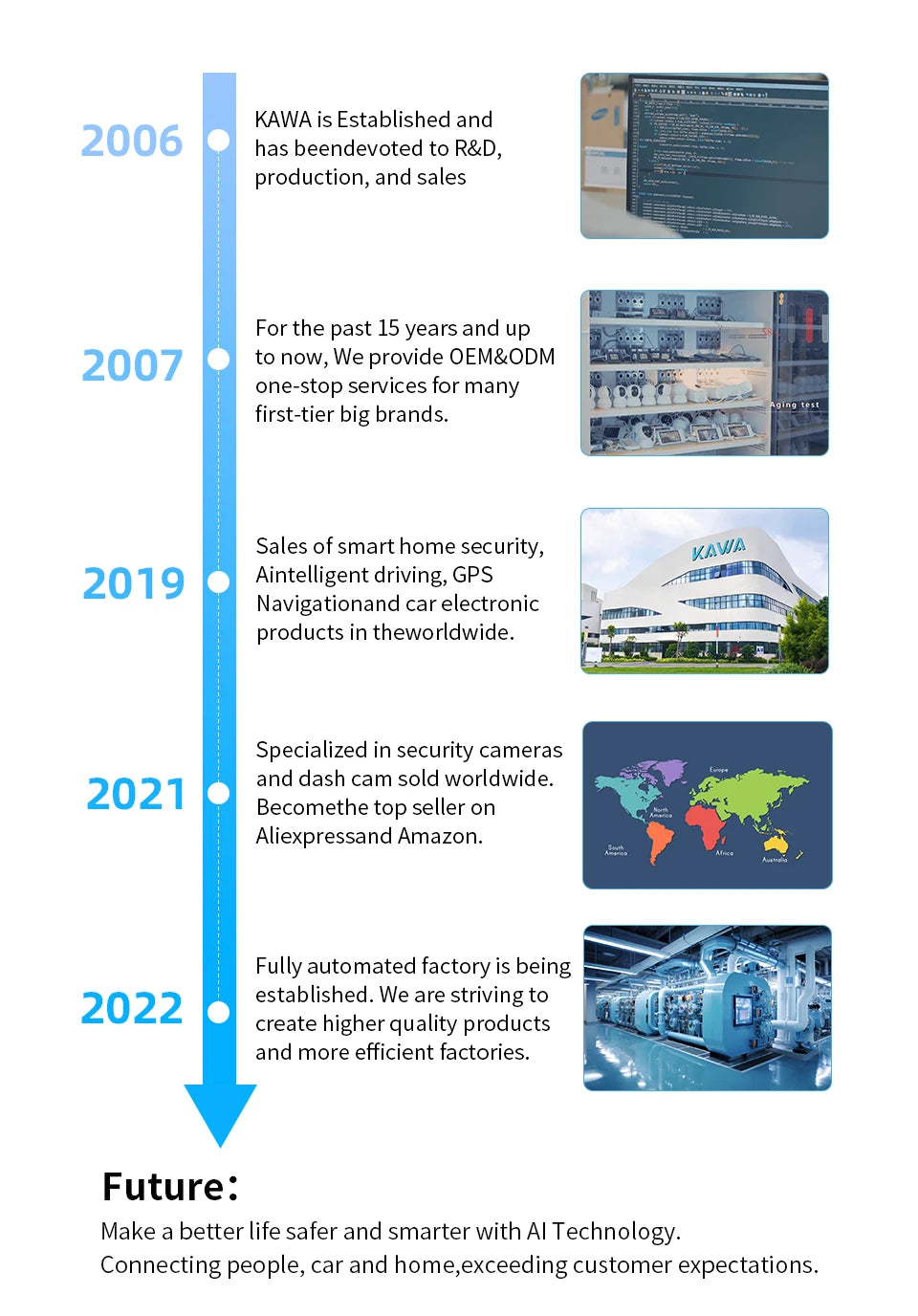 KAWA focuses on the design, R&D and manufacturing of home intelligent security products. We have the R&D team of more than 200 people, and nearly 2000 manufacturing personnel in the automatic production base of 30000 square meters.