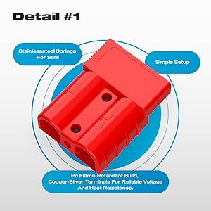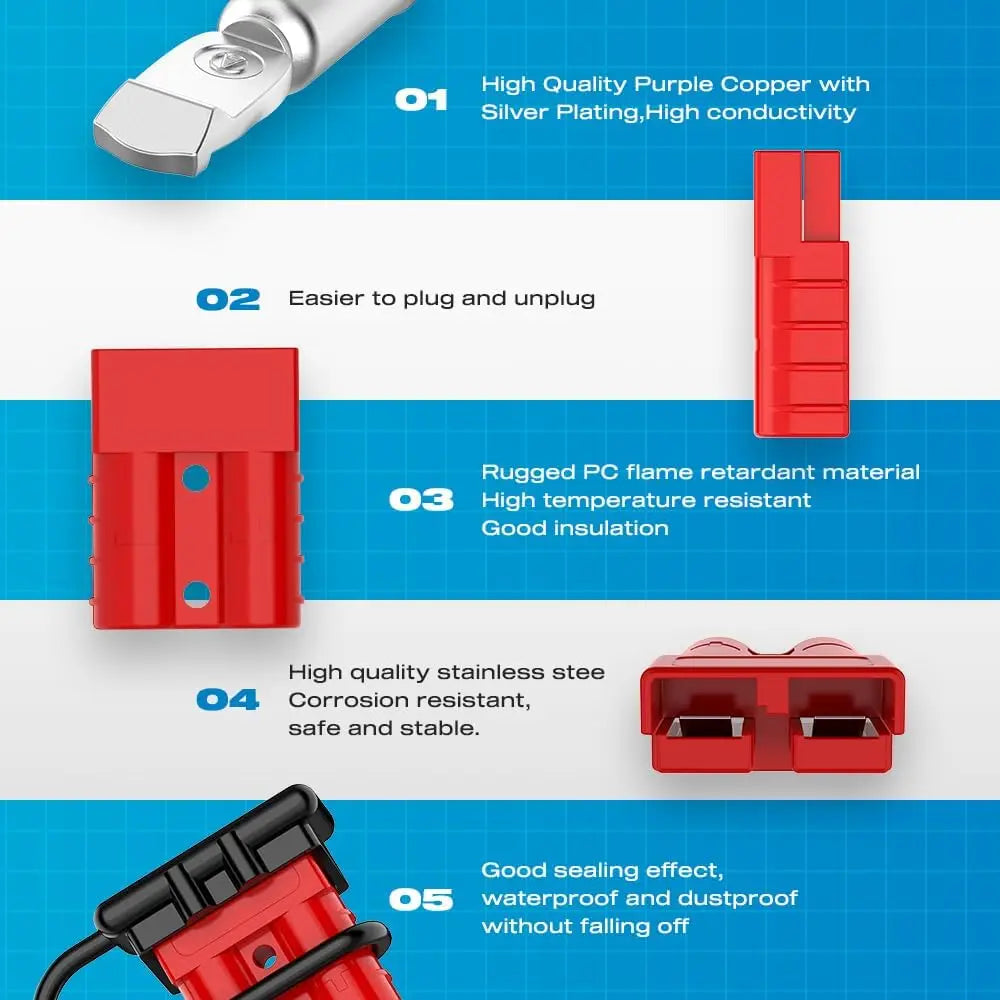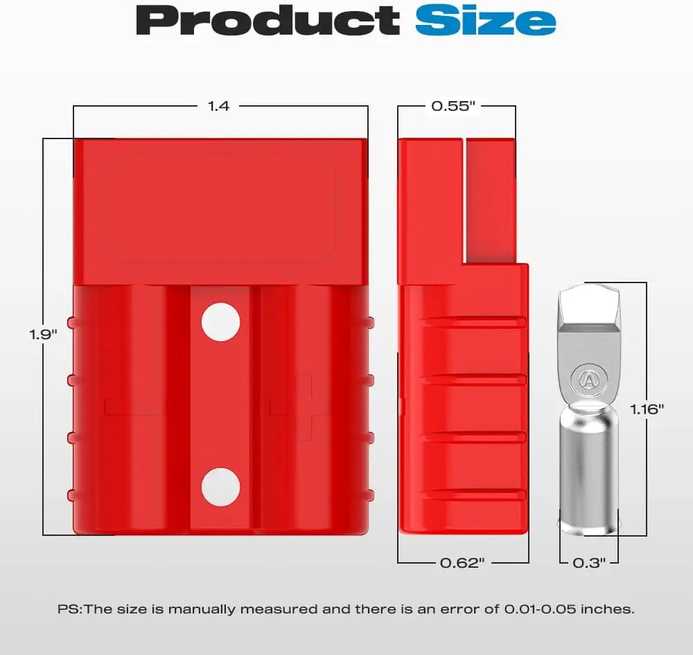 - Attention: Anderson connectors of different colors are not compatible and can only be used with connectors of the same color and model. For example, red connector cannot be used with a gray connector, and a 50A connector cannot be used with a 175A connector. The higher the current, the larger the connector size. Please ensure you confirm the color and model size you need to avoid any inconvenience caused by incorrect purchases.
