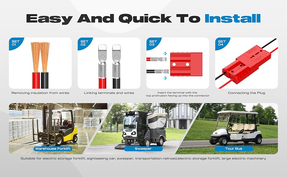 - WIDE APPLICATIONS: Our weatherproof QC plugs provide an easy and convenient way to connect directly to car batteries; for trucks, ATV and RV winches, lifts and cranes; and for electric and outboard motors on boats, as well as for domestic and industrial applications such as lathes, chargers and power inverters.
