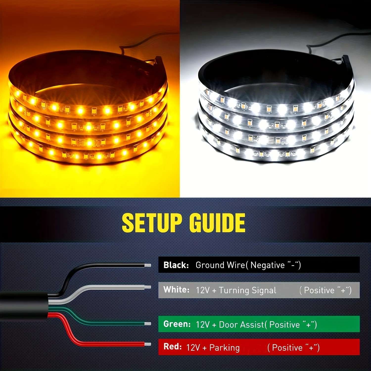 Easy Installation : No need to drill, just peel and stick, black wire is (Ground) negative, red wire to 12V+ parking lights, green wire to 12v+ door Assist, white wire to 12v+ turning signal light. Can also use the additional mounts and screws for extra secure, no worries of falling off.