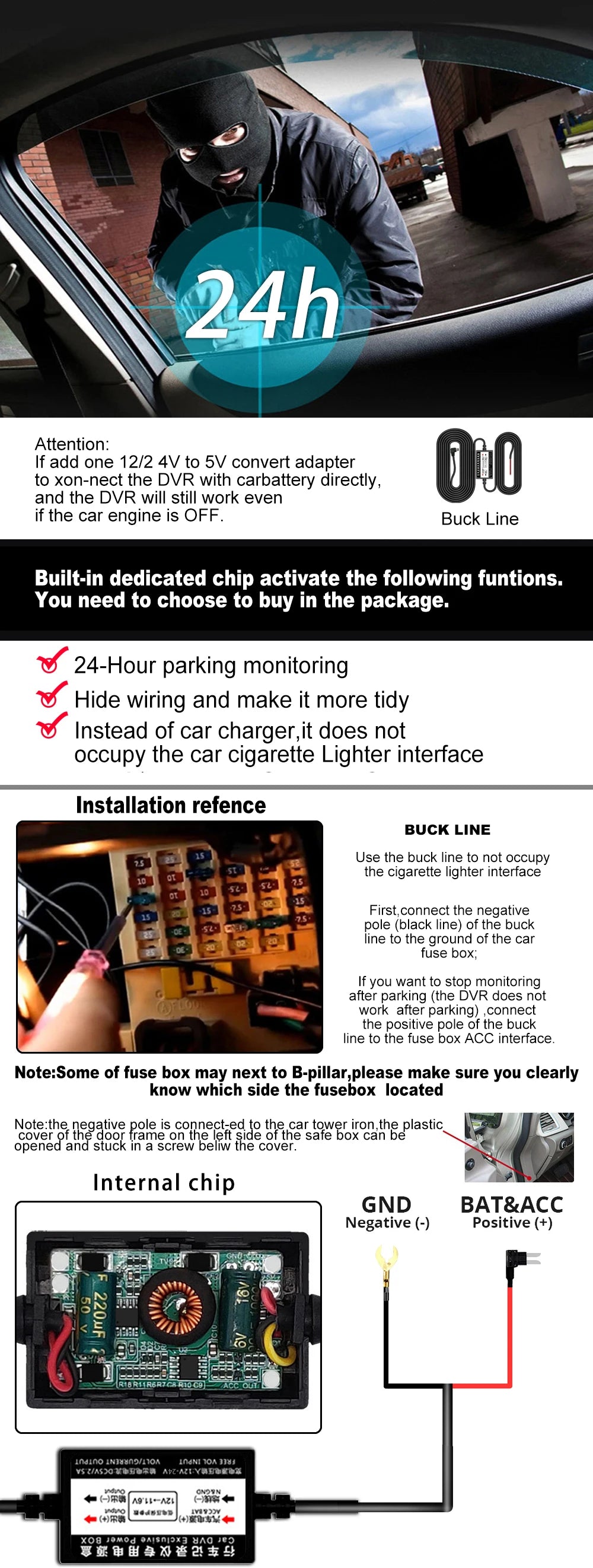 About 24-Hour Parking Monitoring:If you need the 24 hour parking monitoring function, you can order the corresponding Buck Line accessories to replace the car charger.Through Buck Line, the DVR power can be obtained directly from the car battery or car ACC, so that the DVR can maintain normal recording work even when the car is turned off.(Since different car models have different battery interfaces or ACC interfaces, it is not recommended to install it by yourself. It is recommended to find a professional to install the Buck Line.)