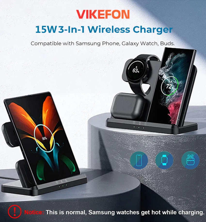 3 In 1 wireless charger for all samsung watch/phones/earphones that support wireless charging.