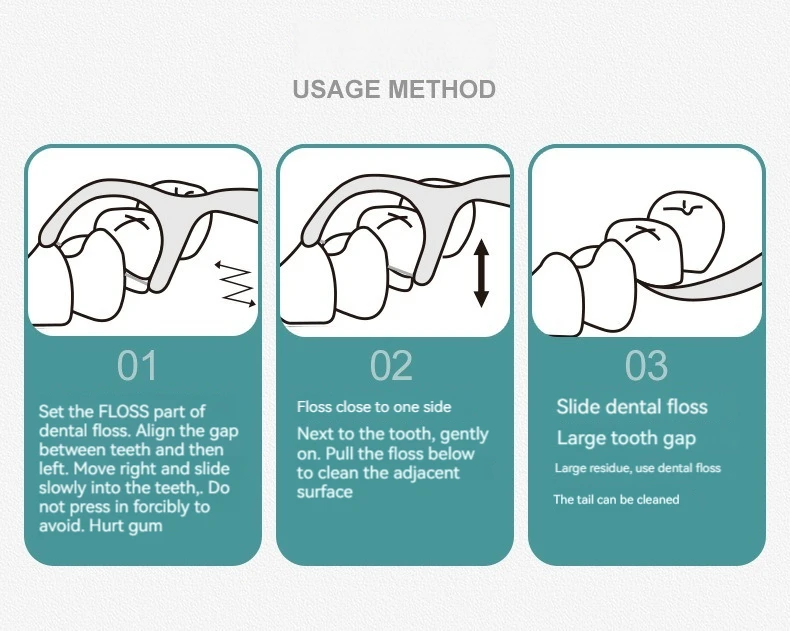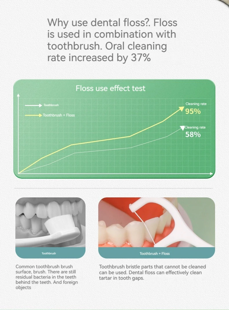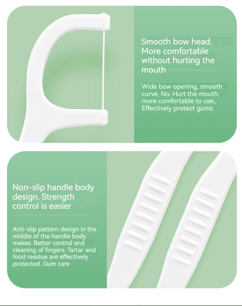 A dental floss stick can clean the teeth. The high-tension fine-sliding dental floss stick and polymer fine-sliding dental floss stick, and the tail hook design can go deep into the inside of the mouth, effectively cleaning the tartar on the inside of the teeth. The polymer polyethylene fiber is used to make dental floss, which goes deep into the teeth, effectively cleaning the teeth, and is flexible, fine-sliding and wear-resistant.
