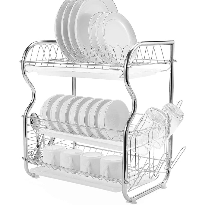 - This 3-layer chrome plated tableware drainer, which is perfect for draining and drying tableware effectively. The design looks modern and elegant. Equipped with a plastic drip tray on the second and the third tier, which can hold water droplets easily and effectively. Good durability, it can support bowls, spoons, chopsticks and plates well. Knives can be hung on the right side, saving space. Easy to assemble and also can be cleaned easily.