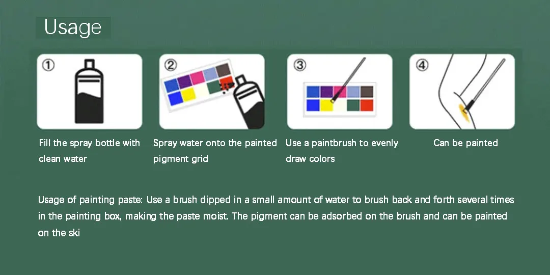 Usage: 1. Wet the paintbrush; 2. Dip in and adjust colors; 3. Quickly dry the color and paint freely on the skin. The colors can be superimposed, and the base color can be applied after drying; 4. Dark tones may leave some residue on the skin and need to be cleaned again with soap or shampoo.