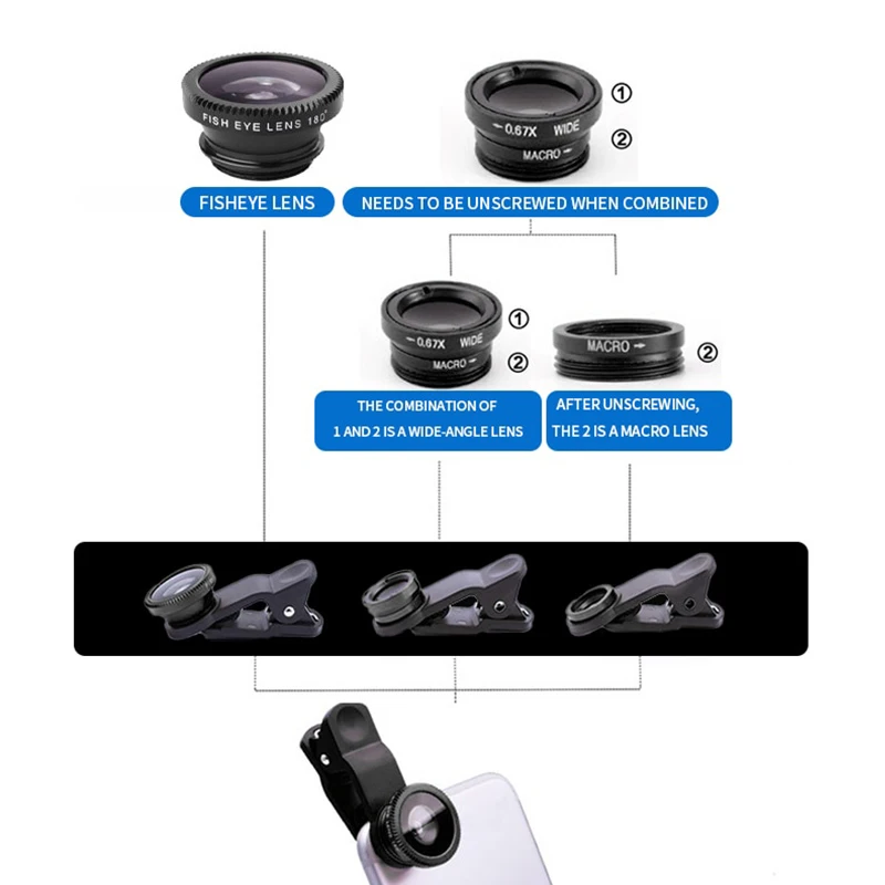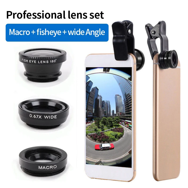 3in1 Fisheye Lens Wide Angle Micro Camera Lens for iPhone 14 13 3IN1 Zoom Fish Eye Len for Smartphone Lenses with Phone Clip