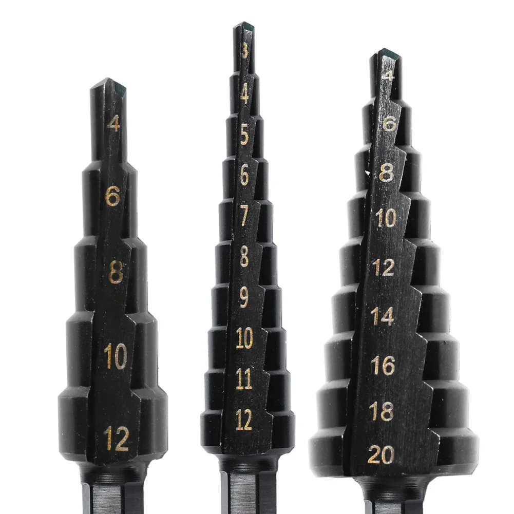 3PCS Hss Steel Titanium Coated Step Drill Bits 3 12mm 4 12mm 4 20mm Step Cone Cutting Tools Steel Wood Metal Drilling Power Set