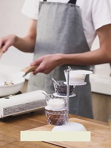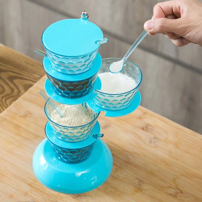 - The overall design of the seasoning box and the five-layer independent box can rotate 360 degrees and can store salt and sugar, and other spices.