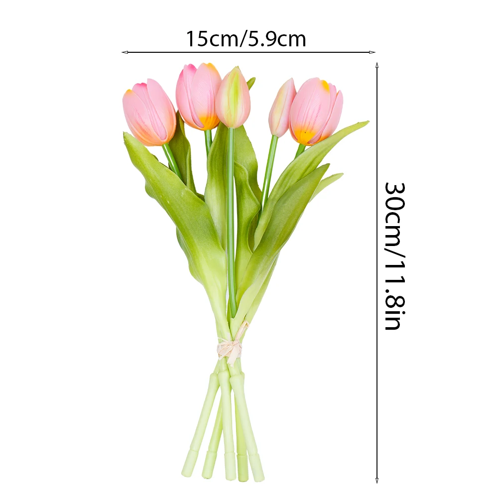 1. Size: Flower stems are about 30cm/11.8 inches high. Tulip Bouquet (3 Flowers + 2 Buds) Package Includes: Artificial Bouquet * 1 piece (5 branches)