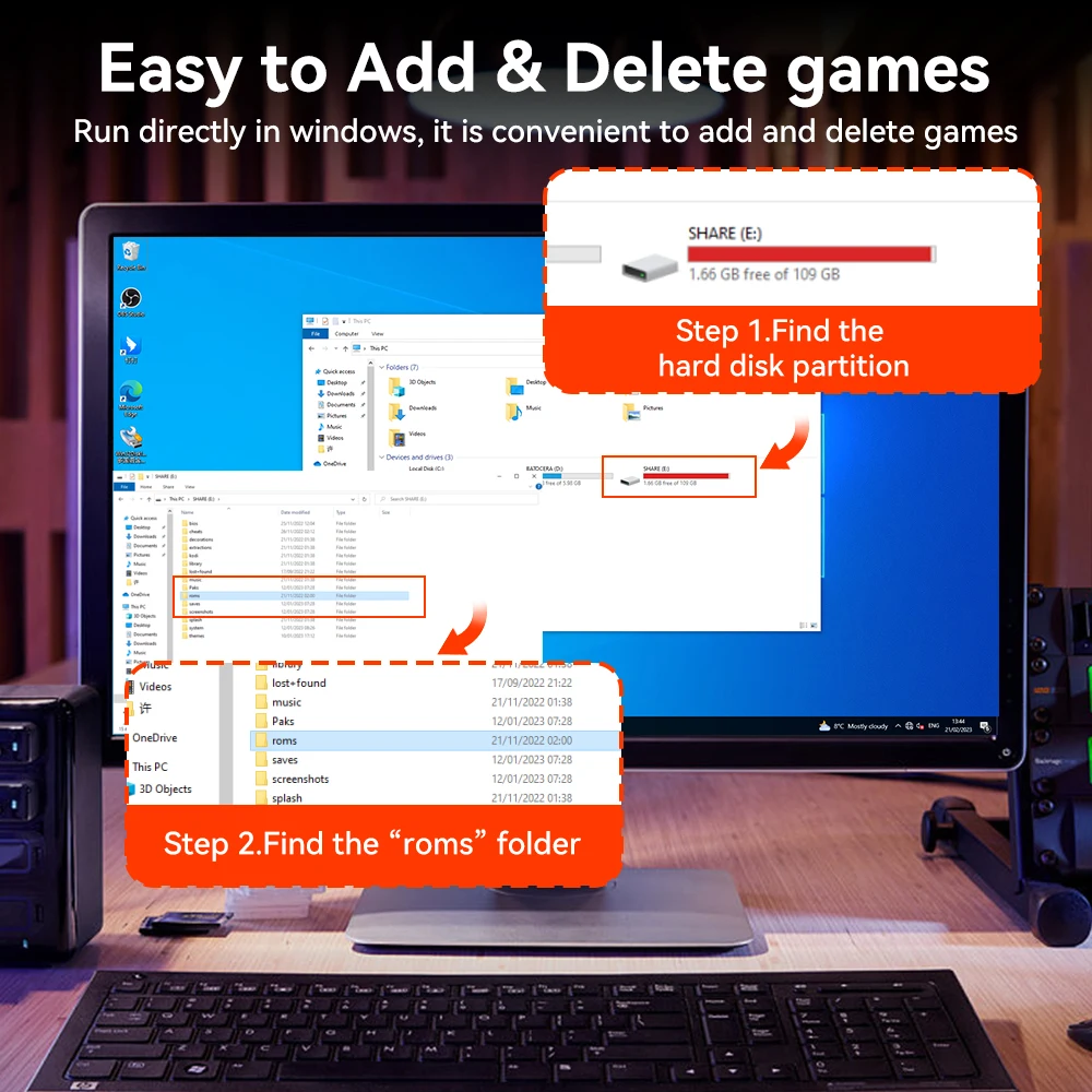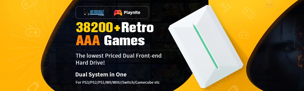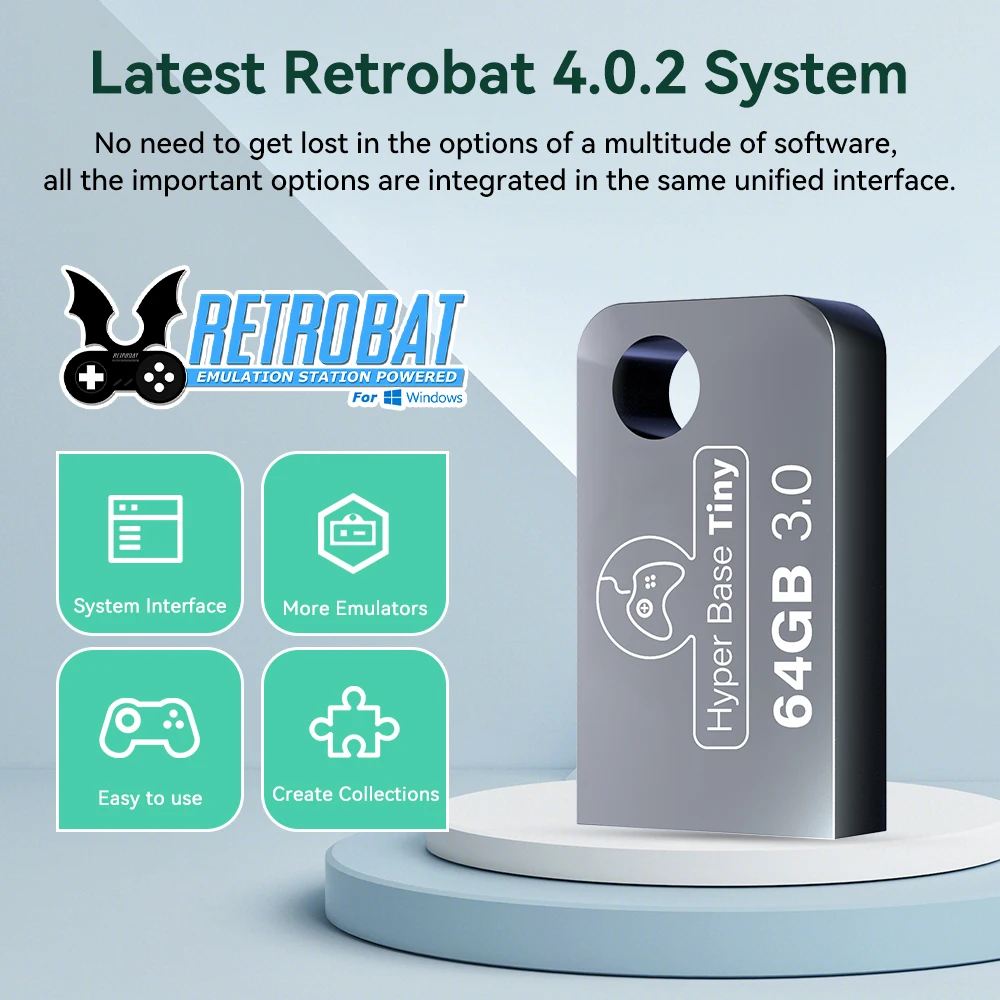This portable USB Disk has a built-in Retrobat system and is suitable for Windows 8.1/10/11. It is recommended to use i5 or above CPUs and GTX750ti or above GPUs produced in the 4th generation or later for a better gaming experience.