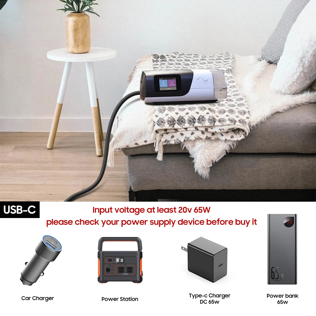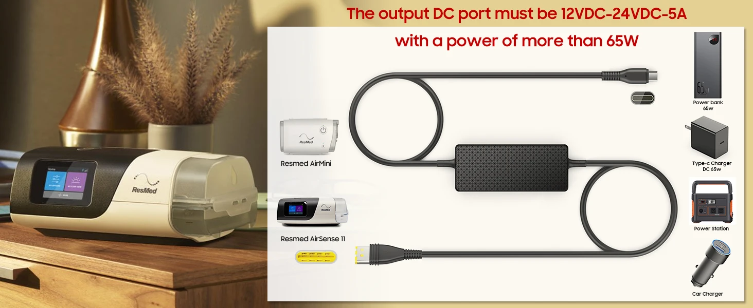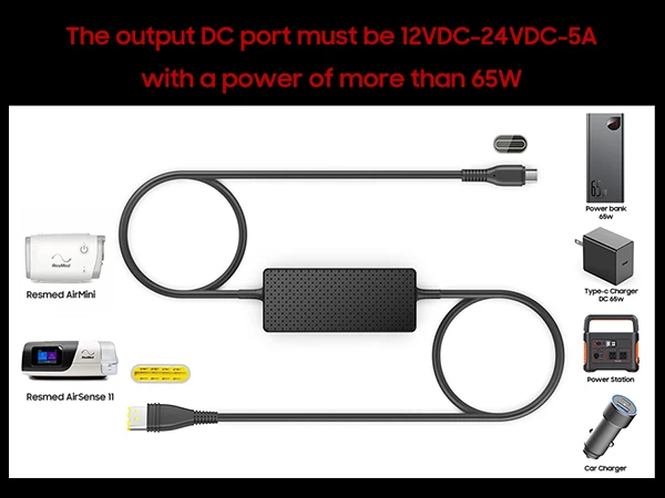 Use this 20V PD USB-C Charging Cable with 24V Cpap battery Backup / Power banks / power stations Batteries to run your ResMed AirSense 11 ResMed AirMini machines. If you're not sure if it work for your device, please feel free to contact us to get support.