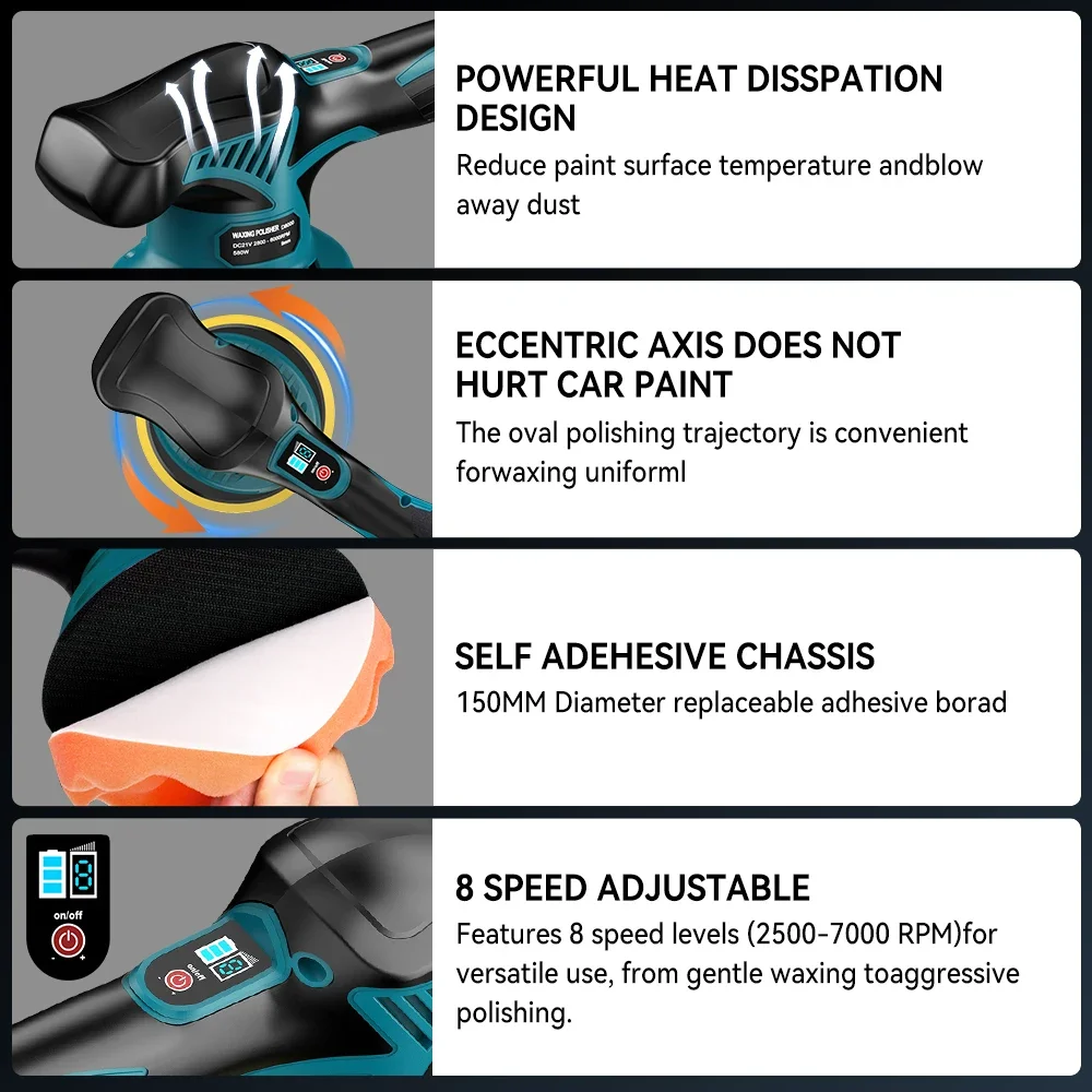 - SPEED ADJUSTABLE:Speed adjustable for 1-8 levels, perfect for waxes, sealants and glazes.