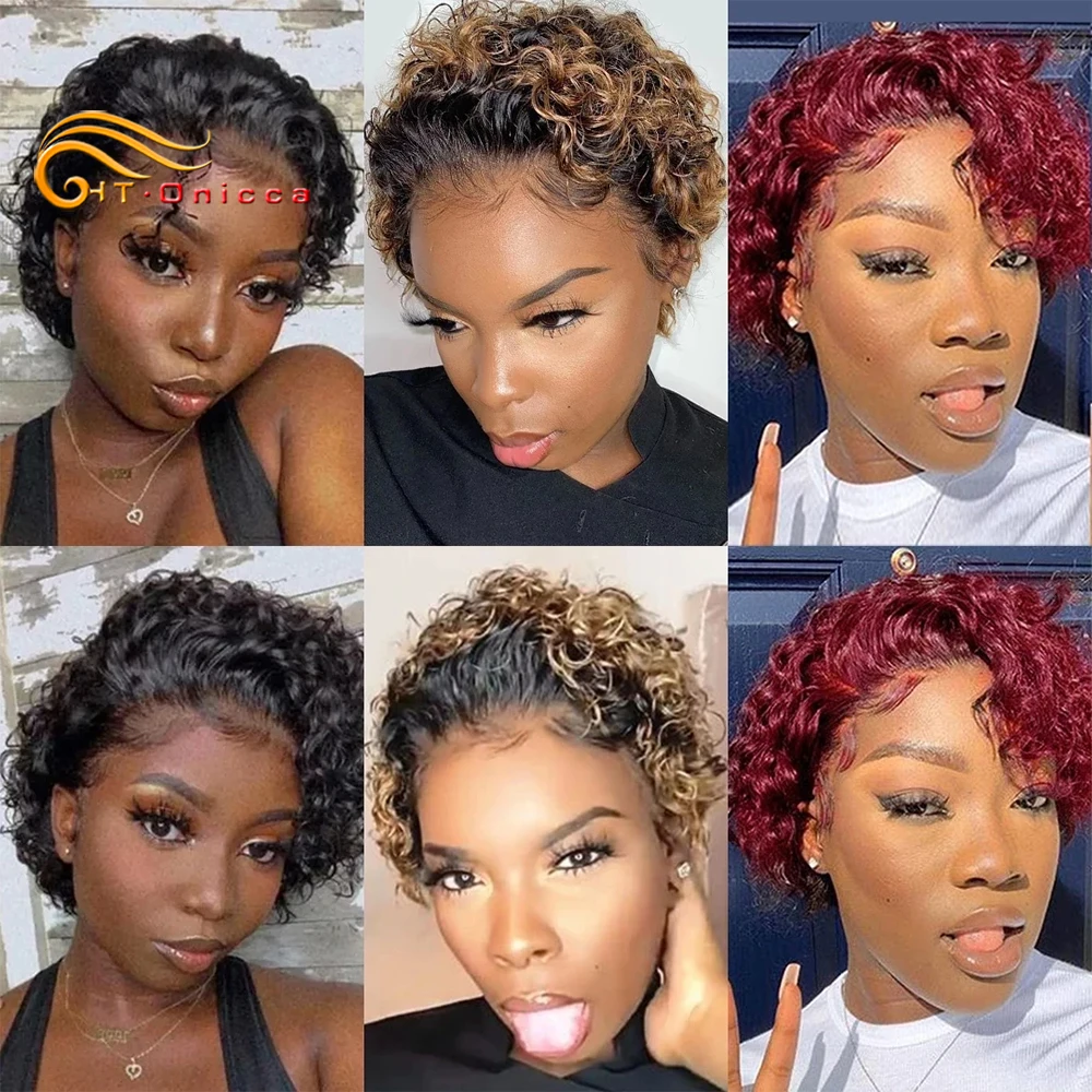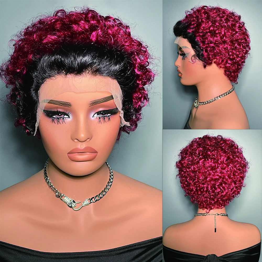 99J Wigs Human Hair Cheap Pixie Cut Wig 13X1 Transparent Lace Wig For Women Short Curly Human Hair Wig 180 Density
