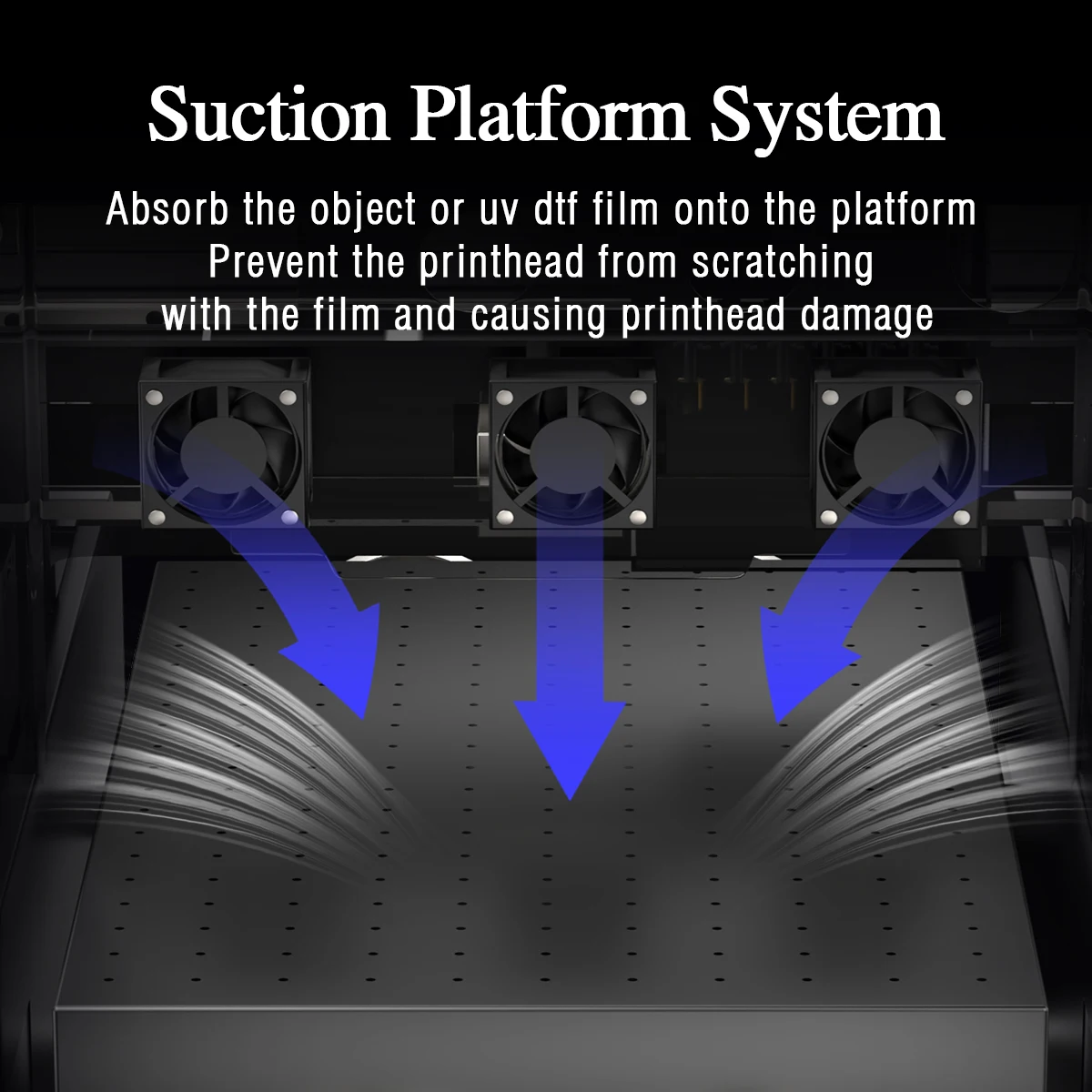 Suction Platform System:Absorb the object or uv dtf film onto the platform Prevent the printhead from scratching with the film and causing printhead damage.