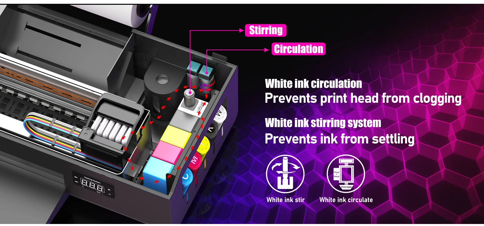1.with white ink circulation and white ink stirring function to prevent ink precipitation and clogging of the print head.