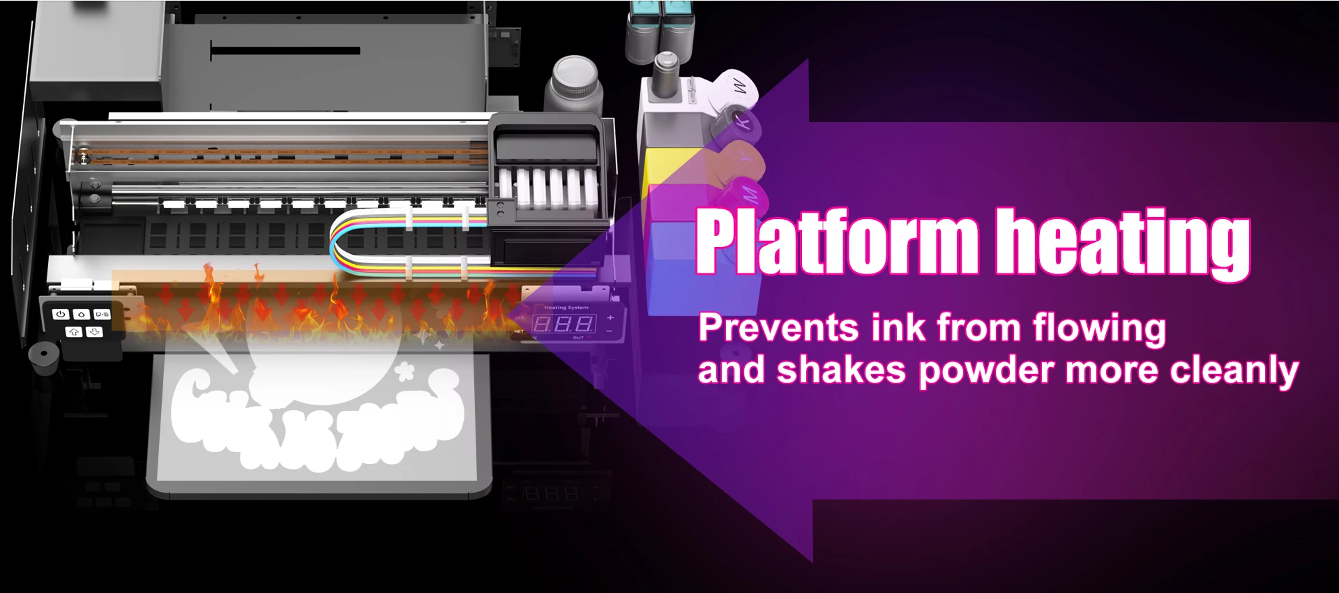 Platform heating:Prevents ink from flowing and shakes powder more cleanly.
