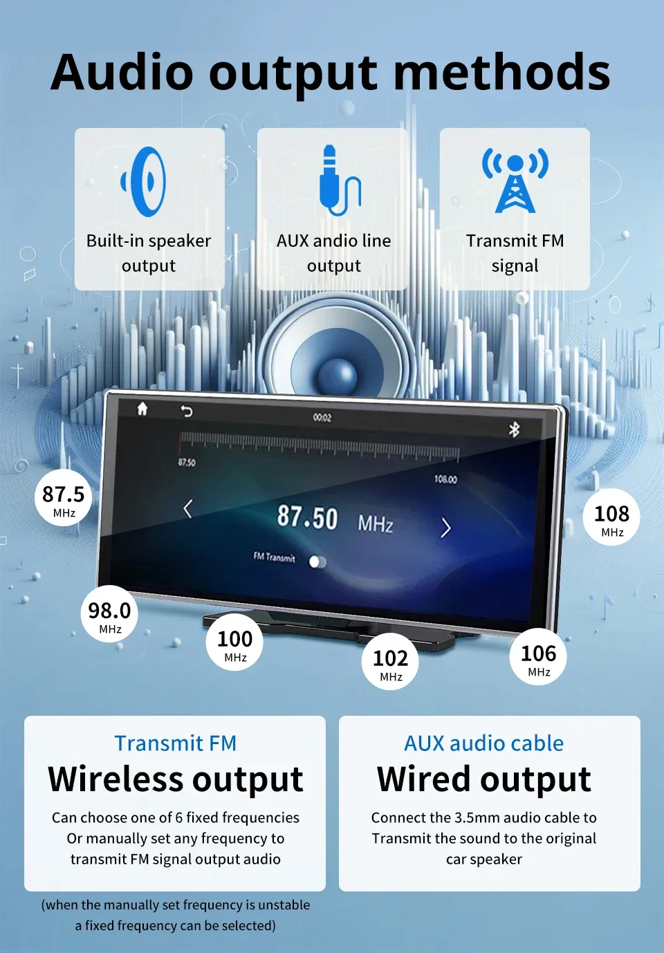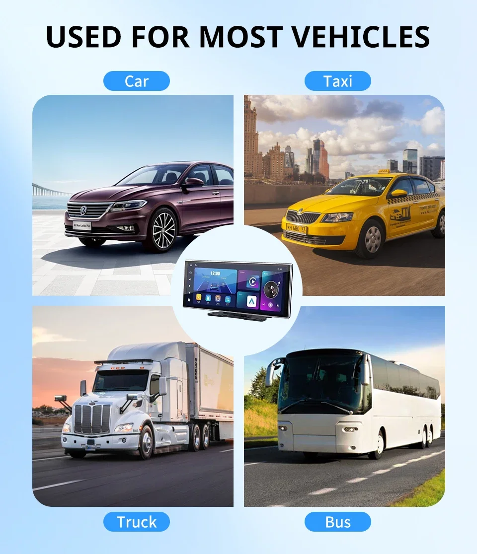 Function:Support IPS screenSupport FM signal transmission functionSupports USB flash drive SD card (audio/video/Image)Supports Bluetooth function (5.0 Bluetooth)Supports WIfi (2.4G+5G)Supports wired mobile projection screen, wired and wireless Android Auto/Apple CarPlaySupports reverse view function (optional AHD camera). When the car is in reverse gear, it will automatically switch to the reverse image.Supports wired and wireless CarPlay+Android Auto, enabling one click navigation, music, voice assistant and other functions on your phone, allowing you to easily enjoy driving pleasureSupports high-definition inverted images (requires camera selection).Working voltage: 12-30VWorking temperature: -10~70 ° CBluetooth version: 5.0 versionDisplay resolution: 19200x720Screen size: 11.26 inchesSingle weight: 0.91kgAudio format: MP3/AAC/APE/OGG/M4A/RA/WAVVideo format: H263/H264/H265/DIVX HD/AVI/FLV/MKWIMPEG/MP4/WMV9NC/ASF/TS/QTImage format: JPG/PNG/BMP/GIF/TIFFLanguage: English, Chinese, Traditional Chinese, Spanish, Portuguese, Russian, German, French, Turkish, Arabic, Hebrew, Italian, Czech, Japanese. Korean, Thai