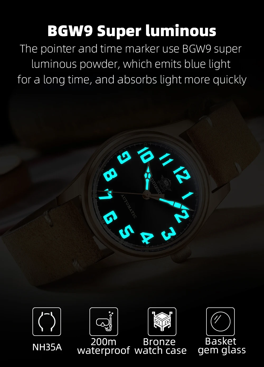 Dial luminous: BGW9 super luminous powder emits blue light