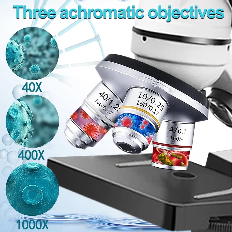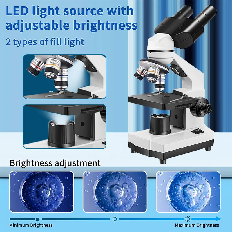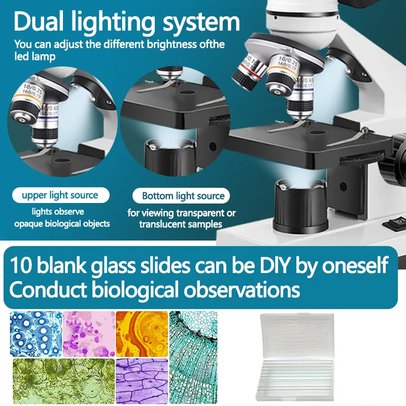 2.Dual LED Light System: Fitense monocular microscopes for adults kids students beginners are equipped with adjustable top and bottom LED lights, providing optimal illumination for solid and transparent specimens, ensuring clear and detailed viewing in any observation scenario