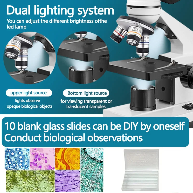 3.5 Color Filter Wheel & Slides and Coverslips Set: The microscope set with slides Includes a 5-color filter wheel (yellow, red, blue, green, purple) for enhanced contrast and 10 PCS slides, 100 PCS Coverslips, making it ideal for detailed and varied microscopic exploration