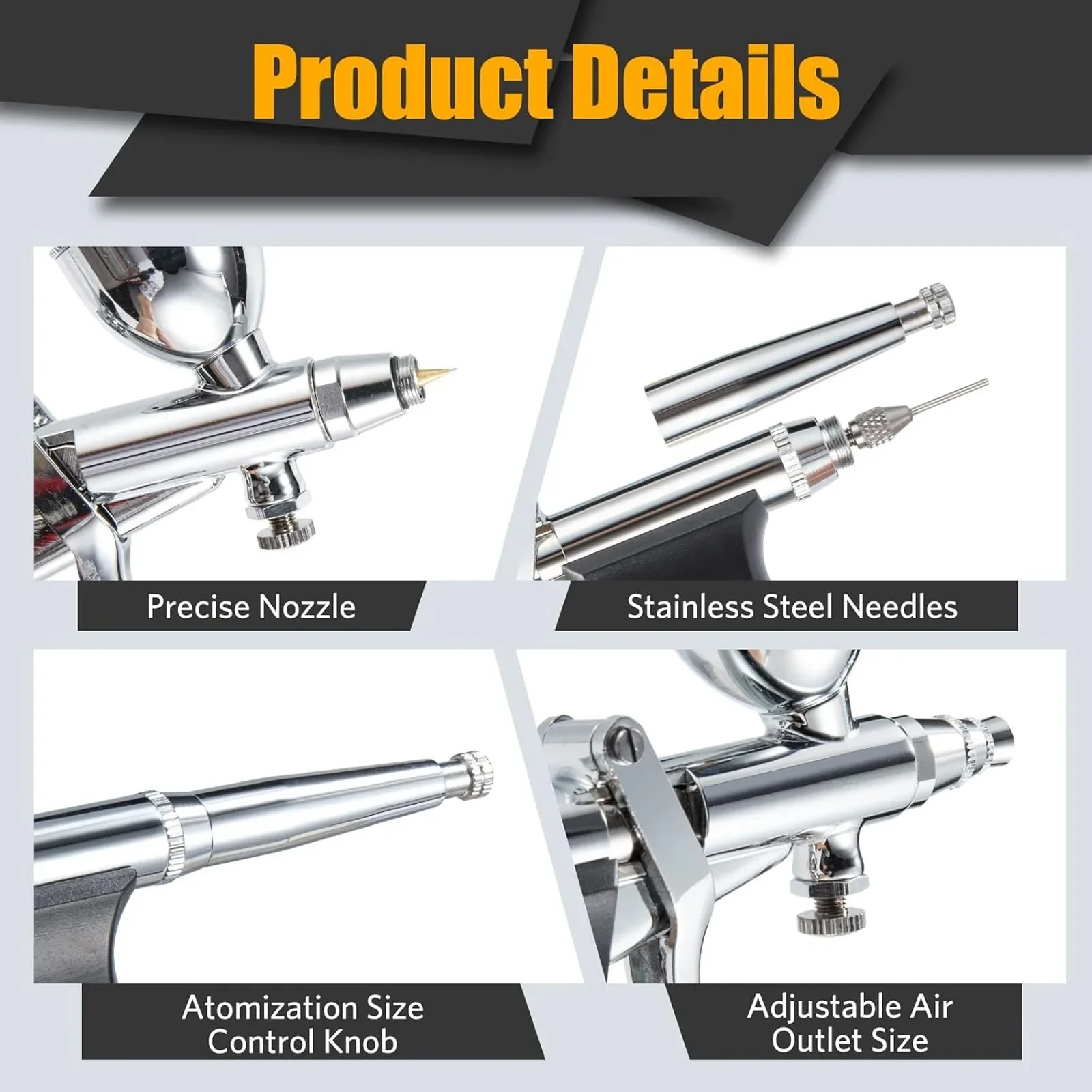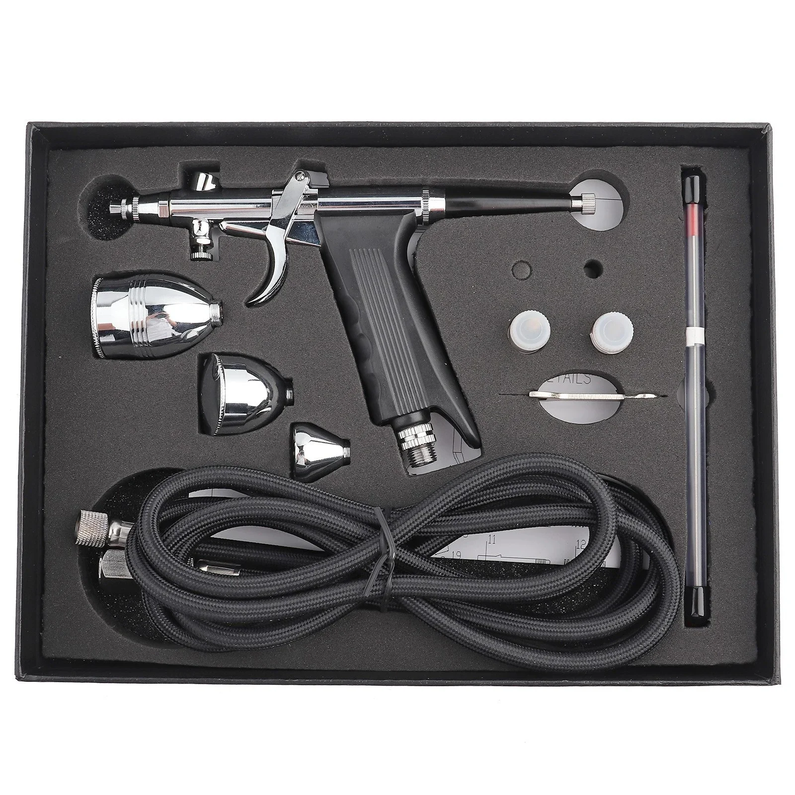 TROUBLE SHOOTING: If you find the airbrush can’t spray or just flow back, please check the screw of airbrush gun's needle, tightness of the pen pressure cap or the the caliber of nozzle, nozzle cap and needle. Detail instrustion vedios are provided in detail page